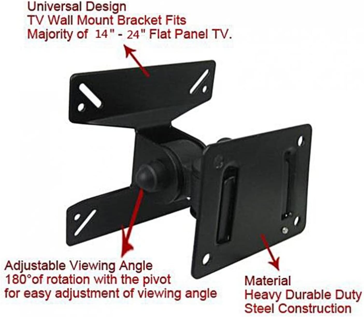 TV Mount StandsDescription Type: Adjustable TypeApplicable Size: 14 - 27 inchesMaterial: SPHC SteelMax Capacity: 10KG / 22.05LBUp and Down Tiltable Angle: 180 degreesVESA Standard Pitch: 75mm x 75 mm, 100mm x 100 mmDistance From the Wall: 100mmLeft and Right Tiltable Angle: 180 degreesFeatures:- With great heavy durable duty steel construction, support swivel 180 degree around the pivot. Making the best visual effects.- With coating finished paint, easy to clean. Classic black color fit for various occasions.- Very easy to install and use, with common hardware pack included in the package.Color: BlackFunction: Universal TV Wall MountShaft Material: Metallic IronApply For Scope: Fit for most HDTV flat panel TV, LCD TV, LED TV, Plasma TV. Suitable For family, entertainment, public places and commercial places such as living room, KTV, bars, airports, railway stations, bus stations, shopping malls, stores waiting hall, lounge, large conference rooms, classrooms, lobby and restaurants and etc.Place of Application: LED Flat Panel TVNote:- When purchasing, please check whether the hole spacing of your TV set is consistent with this product, and whether the weight is within the tolerance of this product.- The quantity of product accessories will be somewhat deviant, but it will not affect installation and usage.Product Weight: 350 G / 12.35 OuncesProduct Dimensions (L*W*H): 123*115*70 MM / 4.84*4.53*2.76 InchesPackage Weight: 420.0 G / 14.82 OuncesPackage Dimensions (L*W*H): 130*120*75 MM / 5.12*4.72*2.95 InchesRetail Packaging: Yes, Colored BoxPackage include 1 x TV Wall Bracket1 x Set Mounting Accessories