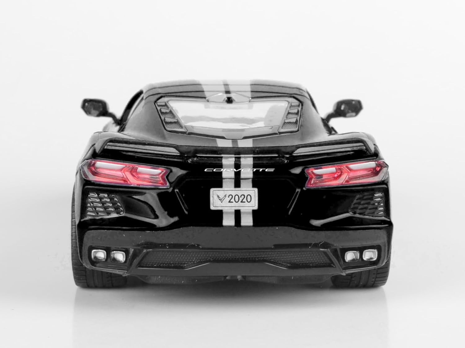 The 2020 Chevrolet Corvette C8 Stingray Black with Silver Stripes by Motormax is a 1/24 scale diecast model from the “Timeless Legends” series. It features an accurately detailed mid-engine design, realistic interior, and opening parts, perfectly capturing the sleek and modern look of the real Corvette.