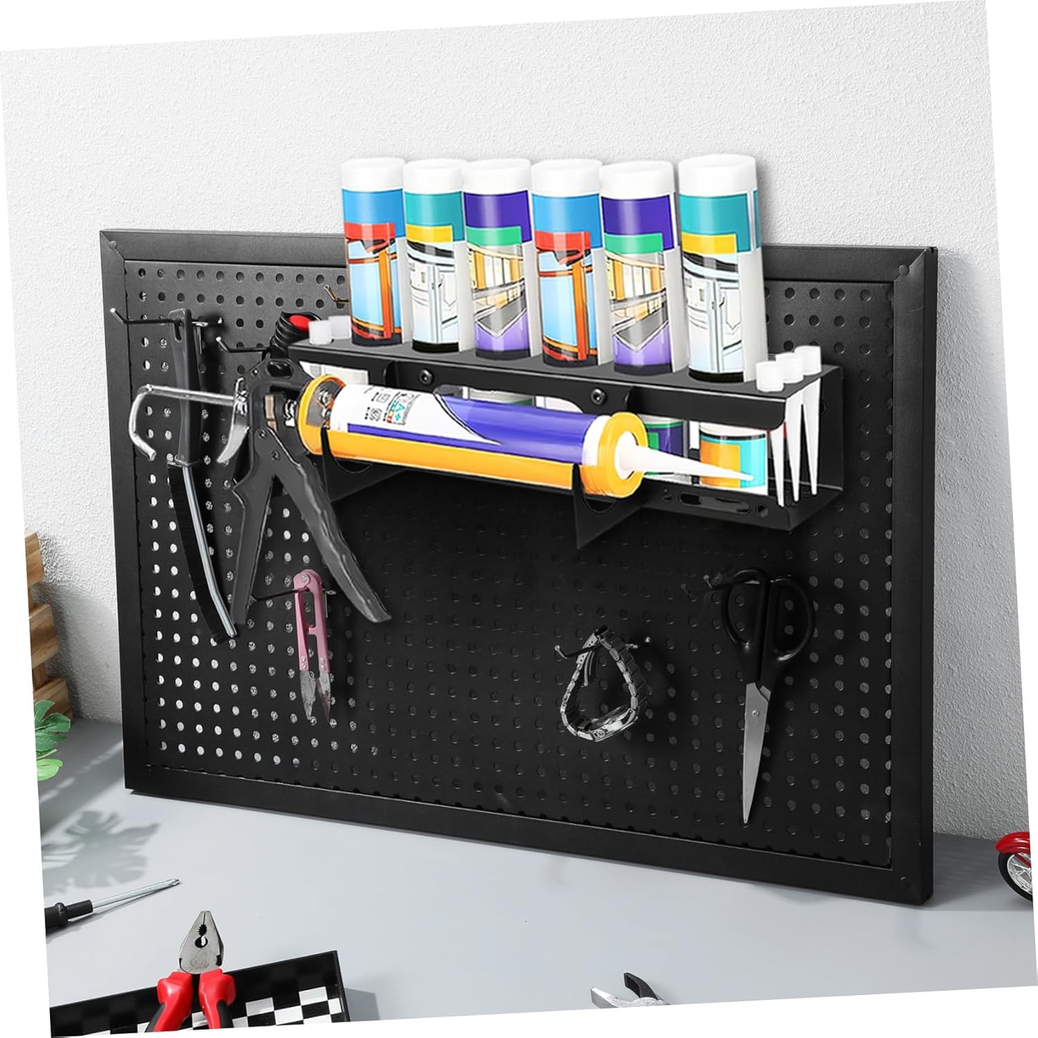 Package Include 1 x Storage rack 1 x Accessory bag Features -Easy DIY installation: designed for quick and simple setup, allowing you to install it in any space without requiring professional tools tool storage organizer -Space optimization design: maximize wall space with an efficient storage solution, keeping your garage or workspace tidy and organized for improved productivity tool organizer racks -Firm material: crafted from wearresistant materials, allowing lasting performance and reliability hanging wall storage - Size: 20.00X8.30X8.10cm/7.86X3.26X3.18in caulking tube storage rack - Size: 40.00X9.00X8.50cm/15.72X3.54X3.34in tool organizer for wall -Color:Black truck tool organizer -Product Info:Wall-mounted tool storage rack -Adjustable shelving: the tool organizer wall mount features versatile shelves that can be adjusted to fit various tool sizes, accommodating diverse storage needs effortlessly wall tool organizer -Material:Iron wall tool organizers storage -Heavy duty construction: this wall mount tool organizer is built with a robust structure to securely hold tools and caulking tubes, allowing easy access and enhanced work efficiency caulking sealant rackGoods Informationwall tool organizer Its firm construction allows lasting use, while the sleek design complements any garage, workshop, or service truck.garage tool storage This wall-mounted caulking tube storage rack is designed to keep your workspace organized and efficient.caulking sealant rack Perfect for holding caulking tubes and tools, it maximizes vertical storage space and keeps essentials within