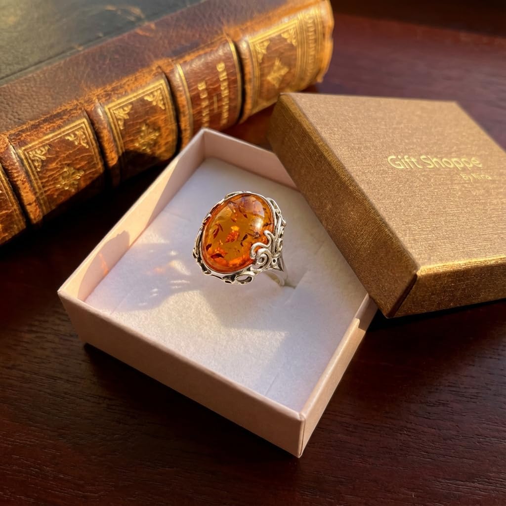Elegant Baltic Amber Ring in 925 Sterling Silver Discover timeless beauty with this handcrafted Baltic amber ring, set in genuine 925 sterling silver. The centerpiece features a rich honey-cognac natural amber stone, glowing with warm golden tones and unique internal inclusions that make every ring truly one of a kind. Amber has been treasured for thousands of years for its natural beauty and organic charm. Formed from fossilized tree resin, Baltic amber is among the most valued varieties in the world, admired for its clarity, warmth, and distinctive character. This statement ring combines vintage-inspired detailing with modern elegance. The ornate sterling silver setting enhances the natural glow of the amber, creating a bold yet sophisticated accessory suitable for everyday wear or special occasions.