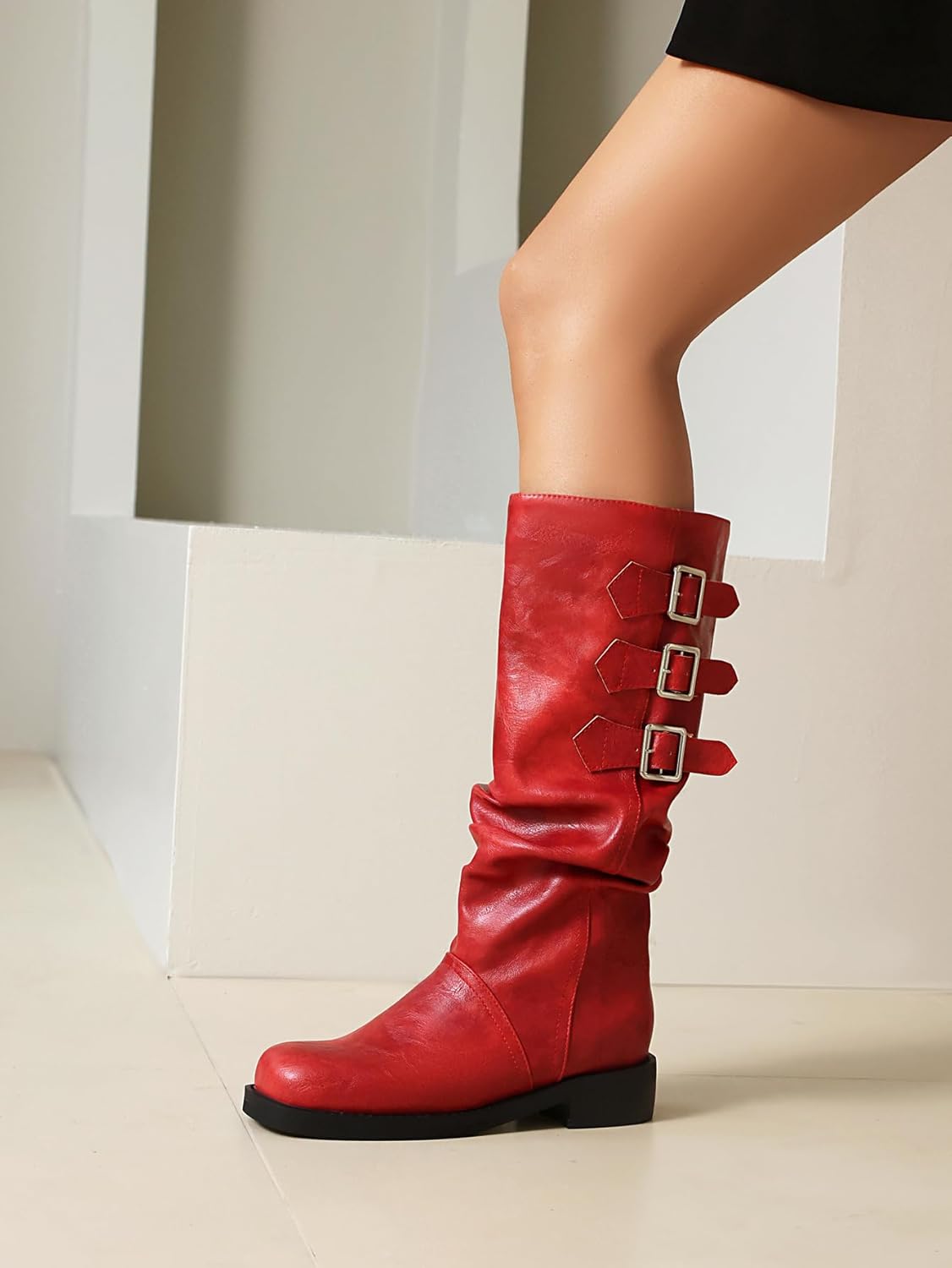 Step into edgy sophistication with these striking knee-high combat boots. Crafted from supple PU leather, these boots feature a distinctive triple buckle design that adds both style and adjustable fit. The slouchy shaft creates a relaxed, lived-in look that pairs perfectly with any casual or semi-formal outfit. The robust construction includes a sturdy sole and comfortable low heel, making these boots ideal for all-day wear. The classic round toe and sleek silhouette offer timeless appeal, while the rugged buckle hardware adds an industrial-chic element. These versatile boots can be dressed up or down - wear them over skinny jeans, with flowing dresses, or tucked into leggings for a bold statement. The construction and quality materials ensure these boots will become a lasting staple in your footwear collection. Perfect for fall and winter seasons, these boots combine practicality with contemporary style.