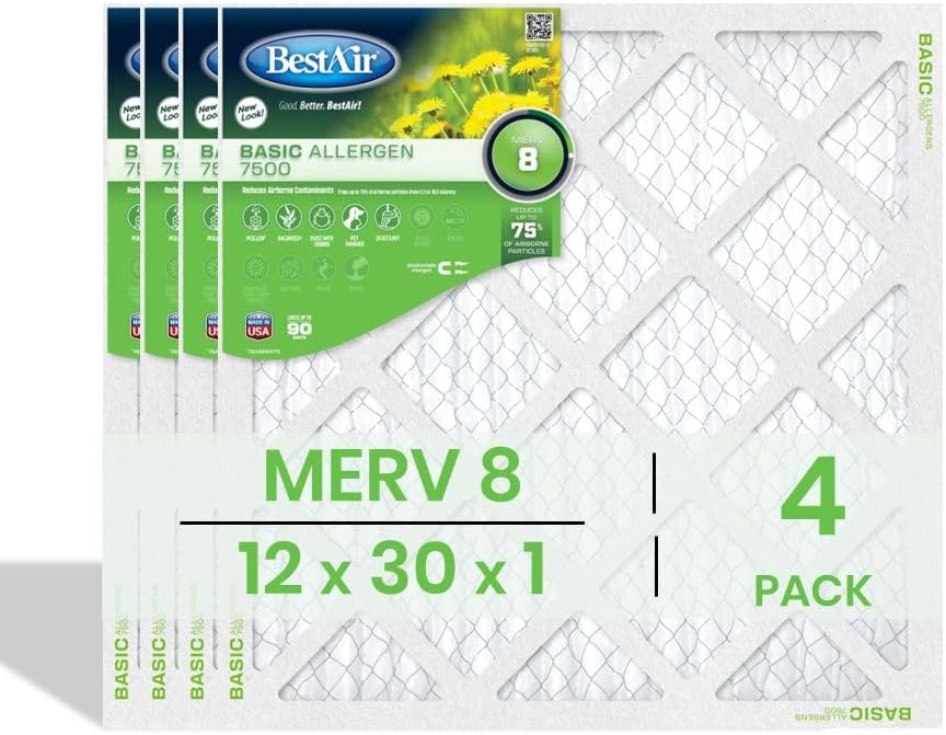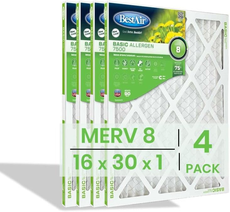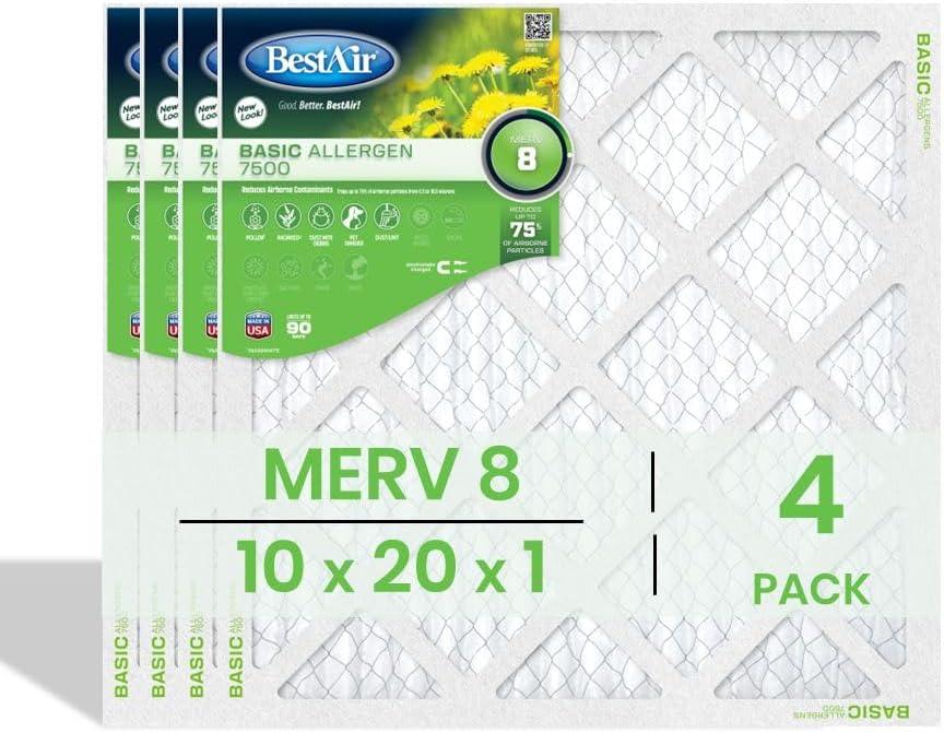 BestAir 20x24x1 Air Filter (4-Pack) | MERV 8 Basic Allergen 7500 HVAC AC Furnace Filter | Replacement Air Filter for Home, Residential & Commercial Use | Made in USA | Actual Size (19.75 x 23.75 x 0.75) | EPA Establishment Number: 85470-TX-1