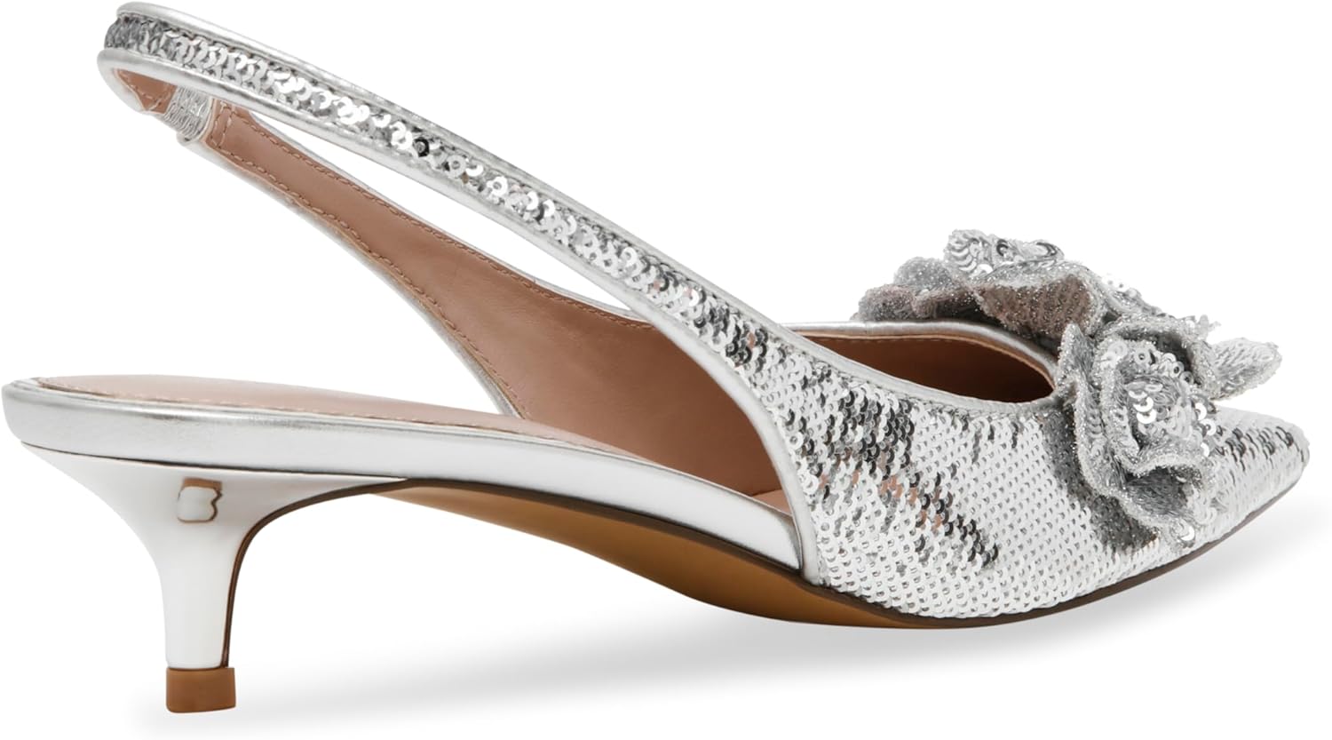 The AURORRA pump features a point toe, flower details, a low kitten heel, and a slingback strap for a sleek and streamlined silhouette.