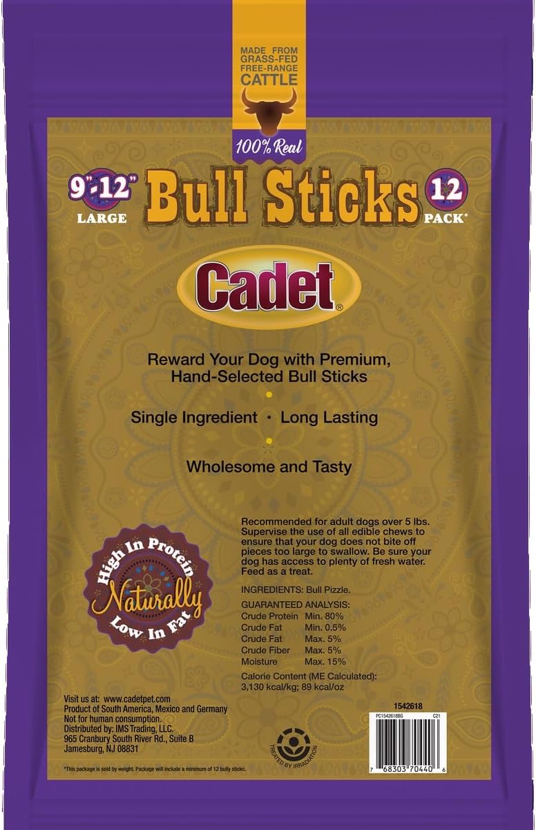 Reward your dog with premium Cadet Bull Sticks, wholesome, naturally delicious long-lasting chew treats that are high in protein and low in fat. Made from grass-fed free-range cattle, these real single-ingredient beef chews contain no fillers or preservatives, and are a great treat for dogs on a gluten-free or grain-free diet. We are pet owners, too, and understand the importance of rewarding our dogs with healthy and natural treats made with only the finest ingredients. That's why we go to great lengths to maintain the quality and consistency of our products, each one USA-inspected to meet our high quality standards.