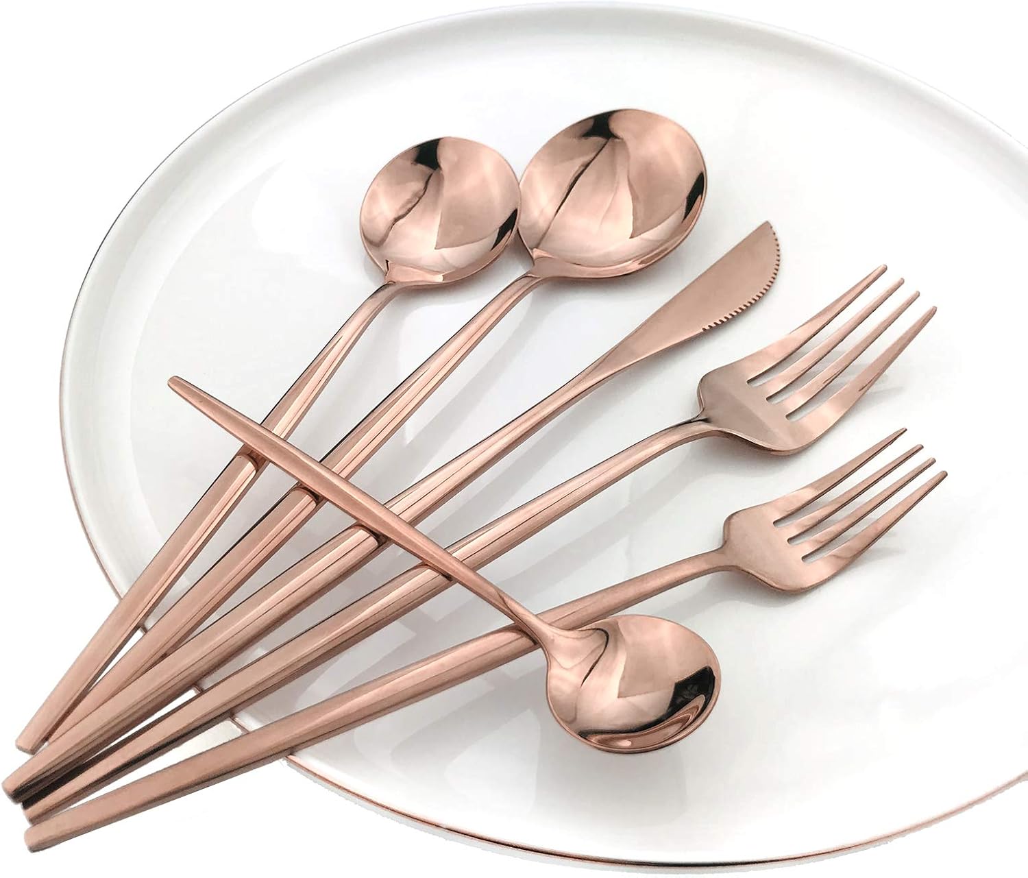 Color:Rose gold *utilizes premium materials and polishing techniques to create a variety of finishes that are reflective and beautiful. *Safe: Food grade, lead free and rust free. * Dishwasher safe, easily clean up by hand-wash. product size Knife: Length: 22cm / 8.66 inch Weight: 40g Dinner Spoon: Length: 21cm / 8.26 inch Weight: 40g Dessert Spoon: Length: 18.5cm / 7.28 inch Weight: 30g Tea Spoon : Length: 13cm / 5.11 inch Weight: 10g Dinner Fork : Length: 21.5cm / 8.46 inch Weight: 30g Dessert Fork : Length: 19cm / 7.48 inch Weight: 20g Using Instruction 1. Please wash the cutlery set with warm soapy water before first using to wash off any processing residue left from manufacturing. 2. Please clean and dry the flatware set after using for your healthy daily use, and store in dry place for its durability. 3. Please use soft towel to clean the set; Do not use iron wire to destroy their smooth surface.