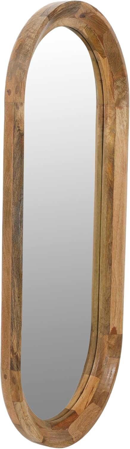 This natural wood oval wall mirror adds style and depth to any living space. This artfully crafted mirror features a sleek wood frame in a natural finish that complements any decor. The mirror is made of mango wood and glass for a durable and elegant look. The mirror has hanging mechanisms for easy installation and can be hung vertically. This mirror is perfect for adding a touch of warmth and simplicity to any living room, bedroom, or bathroom. It measures 21.25 inches wide by 47.25 inches high, making it a perfect size for any space. This mirror is a stunning piece that will add a touch of sophistication to any home.