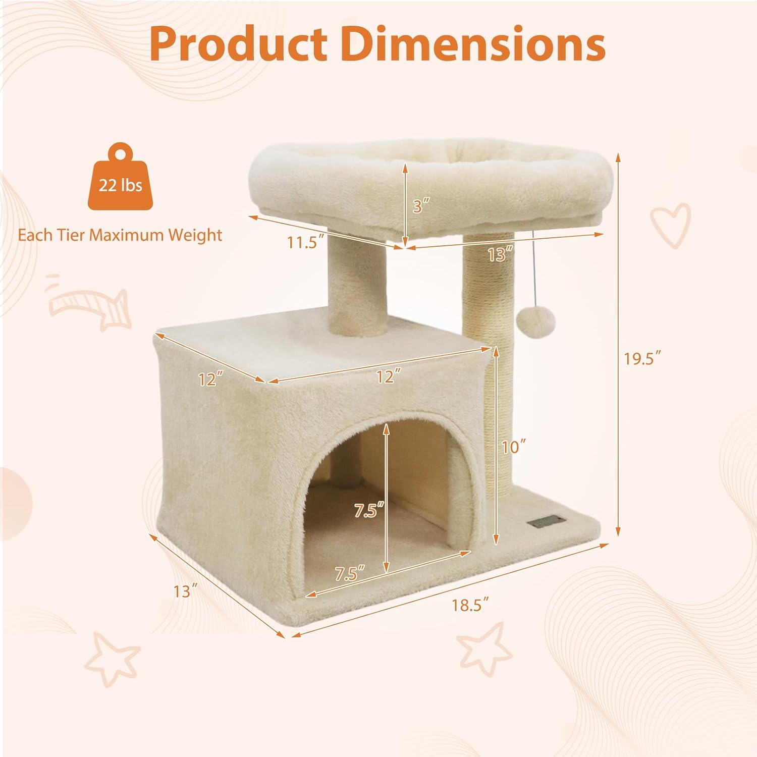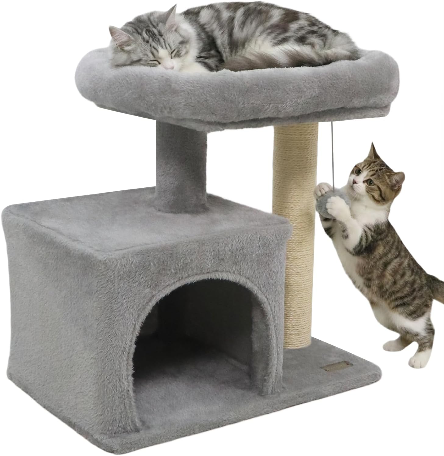 Description:Give your kitten a cozy and engaging space with this compact cat tree.It features a comfortable top perch and a soft plush condo, offering ample room for naps and rest. A natural sisal scratching post keeps your kitten entertained while promoting healthy habits, and a sturdy base ensures stability during play. The addition of a hanging plush ball provides interactive fun and ensures endless fun for your furry friend. Crafted with soft-touch fabric, this small tree is both functional and comfortable. Its space-saving design makes it ideal for small apartments or single-cat homes, perfectly combining comfort, play, and relaxation in 1 simple structure.Features:Compact cat tower ideal for small cats or limited spacesSoft plush-covered condo provides a warm and private resting areaTop padded perch for lounging and observing surroundingsSisal-wrapped post offers a natural surface for scratching and stretchingSturdy construction made from premium boards for long-lasting durabilityStable base keeps the cat tower secure during climbing and playHanging plush ball stimulates cats' curiosity and hunting instinctsAn anti-tipping device provides added safety and peace of mindSmooth edges ensure cat safetyAssembly neededSpecifications:Color: Beige/ Dark Grey/ Light GreyMaterial: Plush Fabric, Sisal, Engineered WoodOverall Height: 19.5"/49 cmBase Dimensions: 18.5" x 13"/47 x 33 cm (L x W)Net Weight: 9 lbs/4 kg