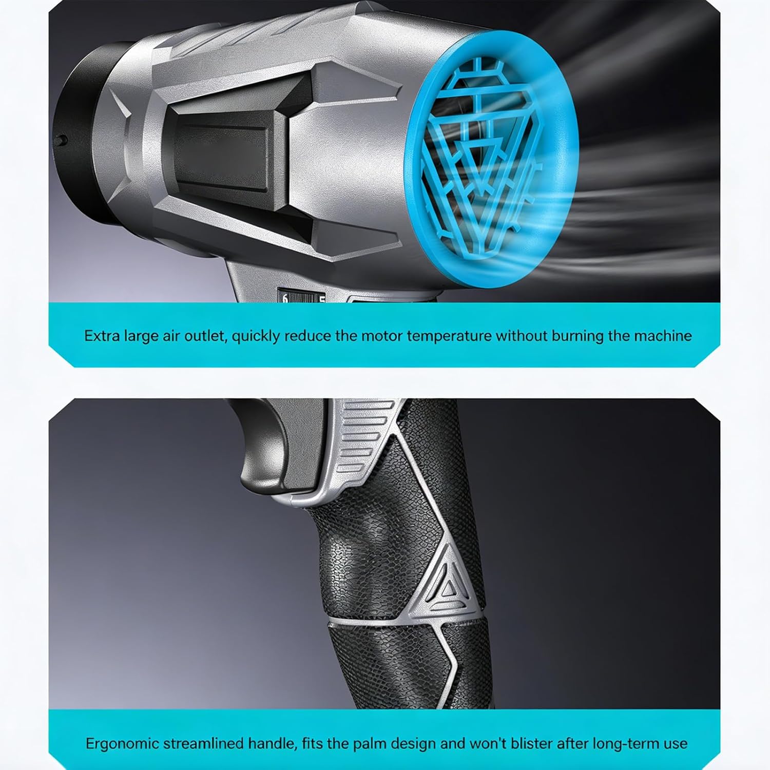 Efficient 21V Battery Powered Blower Equipped With 80mm Air Passage For Rapid Debris Removal Features: 90, 000 Turbocharged Motor: Features a brushless motor with turbocharging technology, intense air movement at 900, 000 rotations for effective debris and removal Ideal for yard maintenance and workshop applications 6 Stage structure: Equipped with six precise settings to handle various tasks like vehicle and outdoor maintenance with ease Perfect for different needs 600W Strong Output & 25m³ Air Movement: Delivers robust 600W energy and air movement up to 25m³ for fast and complete of wide spaces with minimal effort Compact & Ergonomic Design: Designed with an ABS body and comfortable handle for easy handling, enabling extended use without strain Suitable for prolonged operations Long Lasting Construction: Dependable outdoor use in tough conditions Specifications: Product Name: Cordless Electric needle Blower substance: Engineering Size: as shown in the size chart Technical parameters: evaluated power 600W | greatest speed about 900, 000 whirls | Air capacity 25 m³ / min | Full power wind pressure about 1200G Usage scenarios: Family yard needle, home, car interior removal, factory workshop removal Package Includes: Cordless electric needle blower Note: Battery not included in the shipment Before using the accessory, please check it is compatible Pay attention to the storage methods 21v compatible with Motosun batteries
