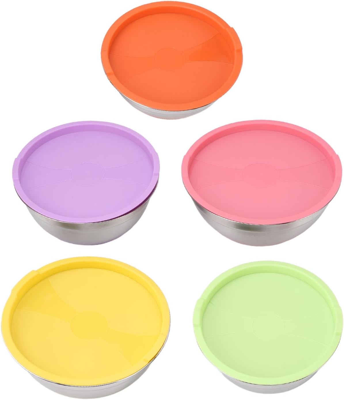 1. Make Your Cooking Much Easier: Mixing bowl set contains 5 piece bowls with lids that will complement your cooking and make cooking much easier. Ideal for making a quick salad, preparing food, mixing batters, or storing and serving food. 2. Multi Use to Meet You Needs: This mixing bowl with lids set is great for everyday use on your home table, they are ideal for serving or even as storage bowls, or ingredient bowls. 3. Space Saving Storage: Easily stacked, so you can save space on the countertop, also they can easy storage stack on top of each other, keep them in a spot in the corner of your kitchen, and easily access your food items. 4. Stainless Steel Mixing Bowls Set: Each mixing bowl is made of stainless steel for lasting use, which is and rustproof. These mixing bowls are dishwasher safe, it is more convenient for you and your family. 5. Easy to Clean: Mixing bowls are not only easy to clean by hand, they are also dishwasher But lids are hand wash only, because using the dishwasher would deform them. These mixing bowls kits suitable for multiple different use scenarios for kitchen. Spec: Item Type: Stainless Steel Mixing Bowls Set Material: Stainless Steel, Plastic, Silicone Weight: Approx. 1342.00g / 47.34oz Diameter:18cm/7.1in, 20cm/7.9in, 22cm/8.7in, 24cm/9.4in, 26cm/10.2in Height: 9cm/3.5in, 10cm/3.9in, 10.6cm/4.2in, 11.3cm/4.4in, 11.8cm/4.6in packing list: 5 x Stainless Steel Mixing Bowls 5 x Lids