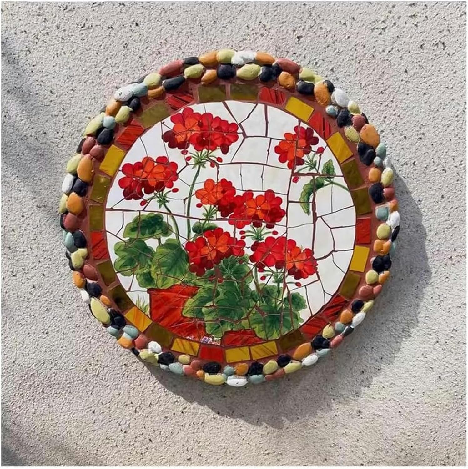 Elevate your yard, walkway or garden with a gorgeous stone!Garden stones make great housewarming gifts. Full of colors and eloquent messages, garden stones are just the thing to make your house a home.Product SpecificationName: Home Decor/3D Outdoor Wall Art Decor/Garden Decor FootstoneMaterial: Cement and ceramicsInstallation: wall-mounted, Mosaic Stepping StonesDiameter: 37cm/10.63inWeight: 3.5KG/pieceThickness: 2cmShape: RoundStyle: Country StyleCraftsmanship: hand-painted colored porcelainUse scope: Garden, lawn, wall, Sidewalk, vegetable gardenPackageGarden Footstone x 1