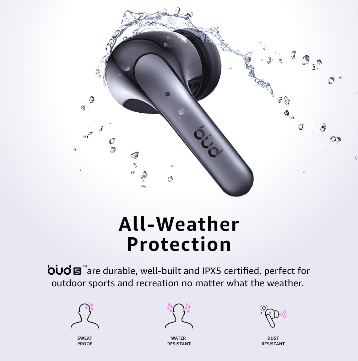 | Additional Features | Dual Microphones, Noise Cancellation,, Long Battery Life, 36 Hours Listening Time with ANC ON, Small, Lightweight, Comfort Fit, Touch Control, Touch & Talk, On-Device Controls, Water Resistant, Sweat Resistant, Dust Resistant, All-Weather Resistant |