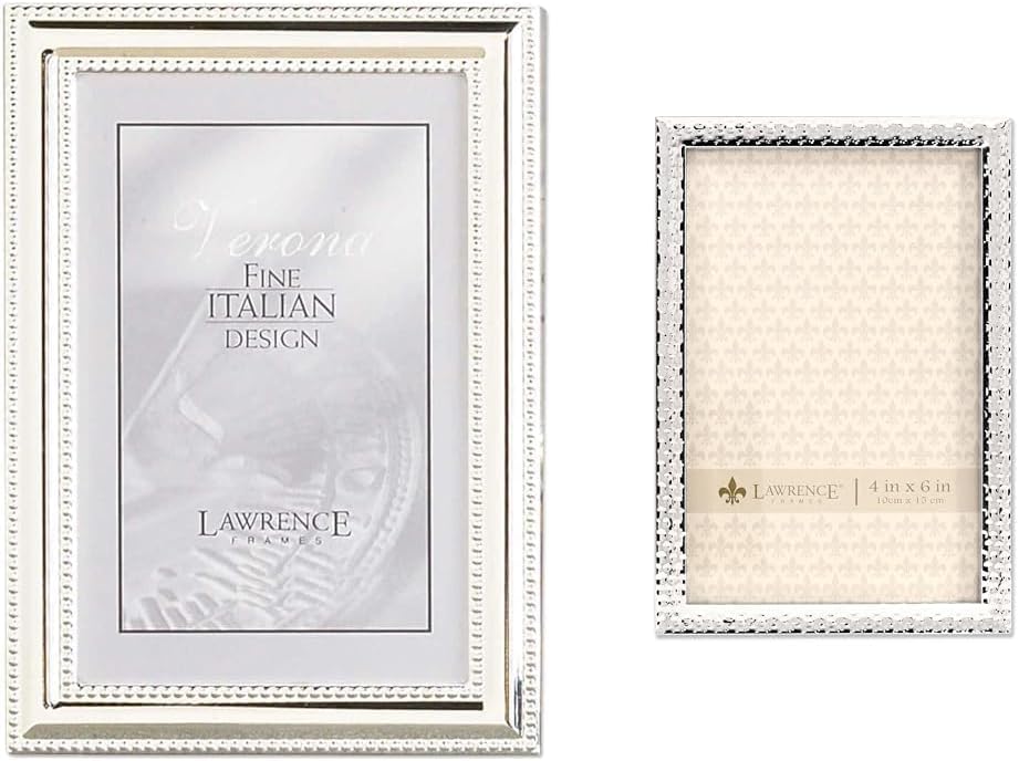 Capture your most cherished memories in style with this picture frame bundle. The first frame features a classic silver-plated metal design with delicate beading around the edges, adding a touch of elegance to any photo displayed within. It comes equipped with navy blue velvet backing and can be displayed vertically or horizontally on a tabletop or wall mounted. The second frame has an eye-catching hammered metal design in polished silver plate, complemented by black velvet backing. Like the first frame, it can be used as a tabletop display or wall art, showcasing photos in either orientation. With one traditionally styled and one decoratively designed frame, you'll be prepared to display a variety of photo sizes and styles. The first frame fits 5 by 7 inch photos within its sturdy, heavy weight metal construction while the second frame fits 4 by 6 inch photos. Both are made to the highest quality standards and come gift boxed. Together these frames create a versatile display solution for your most precious memories.