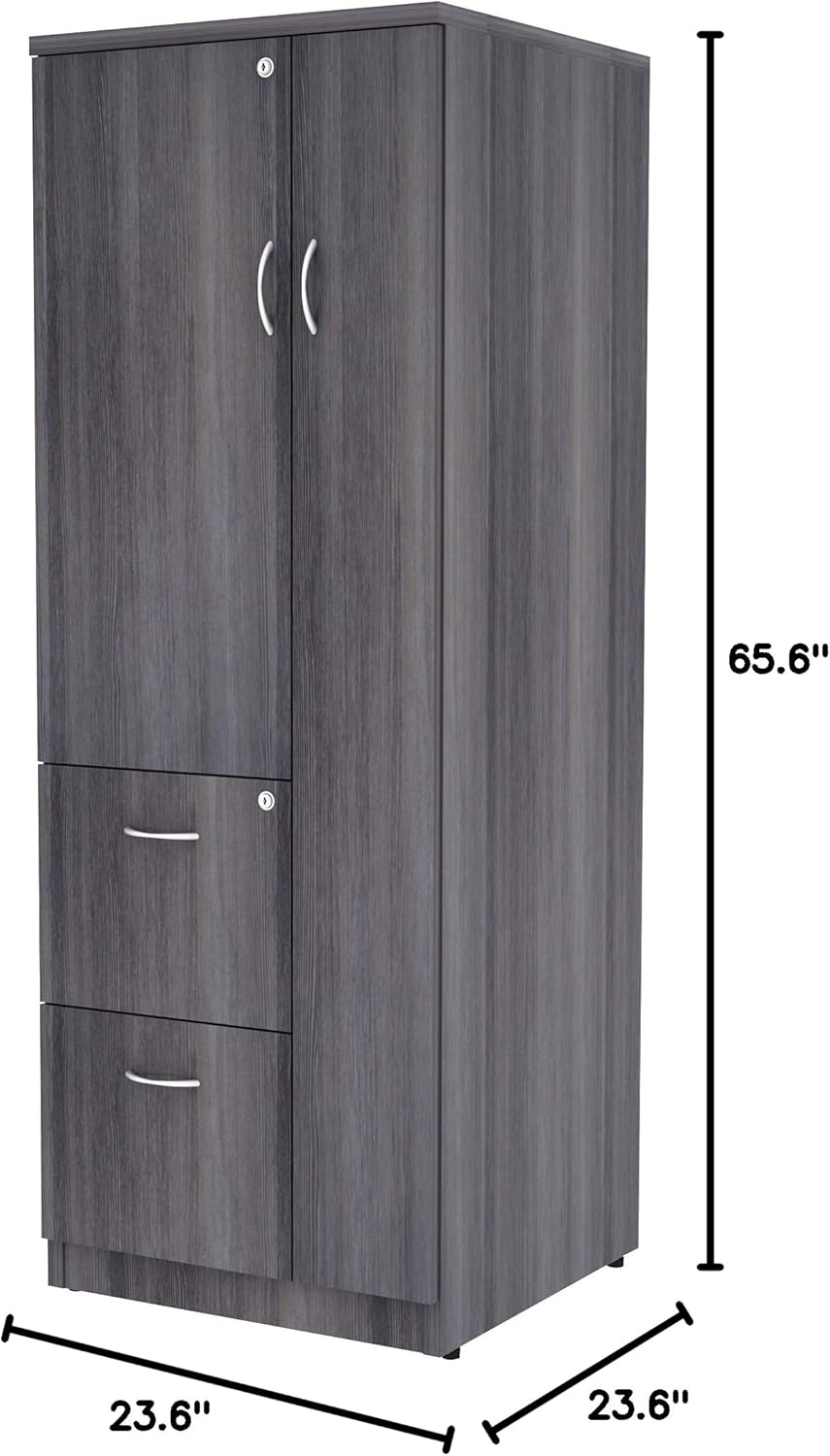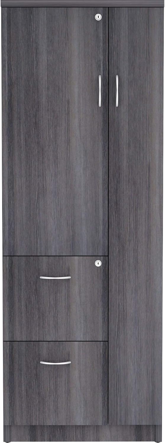 Tall storage cabinet is part of Lorell Relevance Series, versatile and stylish office furniture that configures to meet your needs. Weathered Charcoal laminate exterior matches other units in the series for a cohesive, professional look. Full-length compartment on the right features a door to conceal contents. On the left, the half-length compartment includes a locking door and two shelves. The bottom two drawers lock to secure your belongings and hold letter-size files. Durable, Weathered Charcoal laminate surfaces provide a professional look and are abrasion-resistant. The back is finished on both sides. Cabinet is made of particleboard and medium-density fiberboard. Adjustable levelers help stabilize the cabinet on uneven surfaces.
