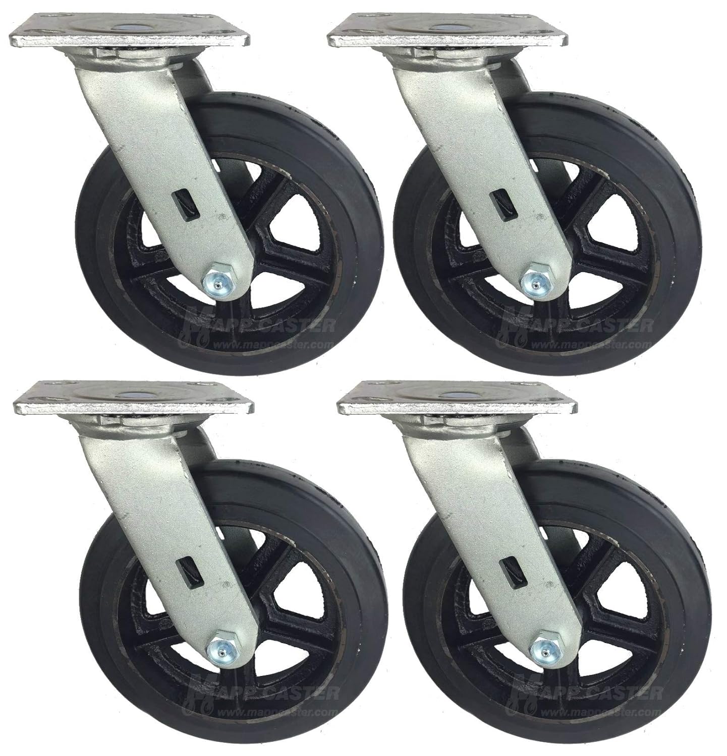 These casters are designed to be used as replacements for drywall dollies and sheetrock dollies. The listing is for a set of 4 swivel casters. These caster wheel features a rubber tread that offers good floor protection and provides a smooth and quiet roll. Each wheel measures 8 inches in diameter and has a 2 inch wide tread. The mounting height is 9-1/2 inches. The capacity is 600 pounds per caster and 2,400 pounds for all four casters. If you have questions, please contact Mapp Caster, we are happy to help.
