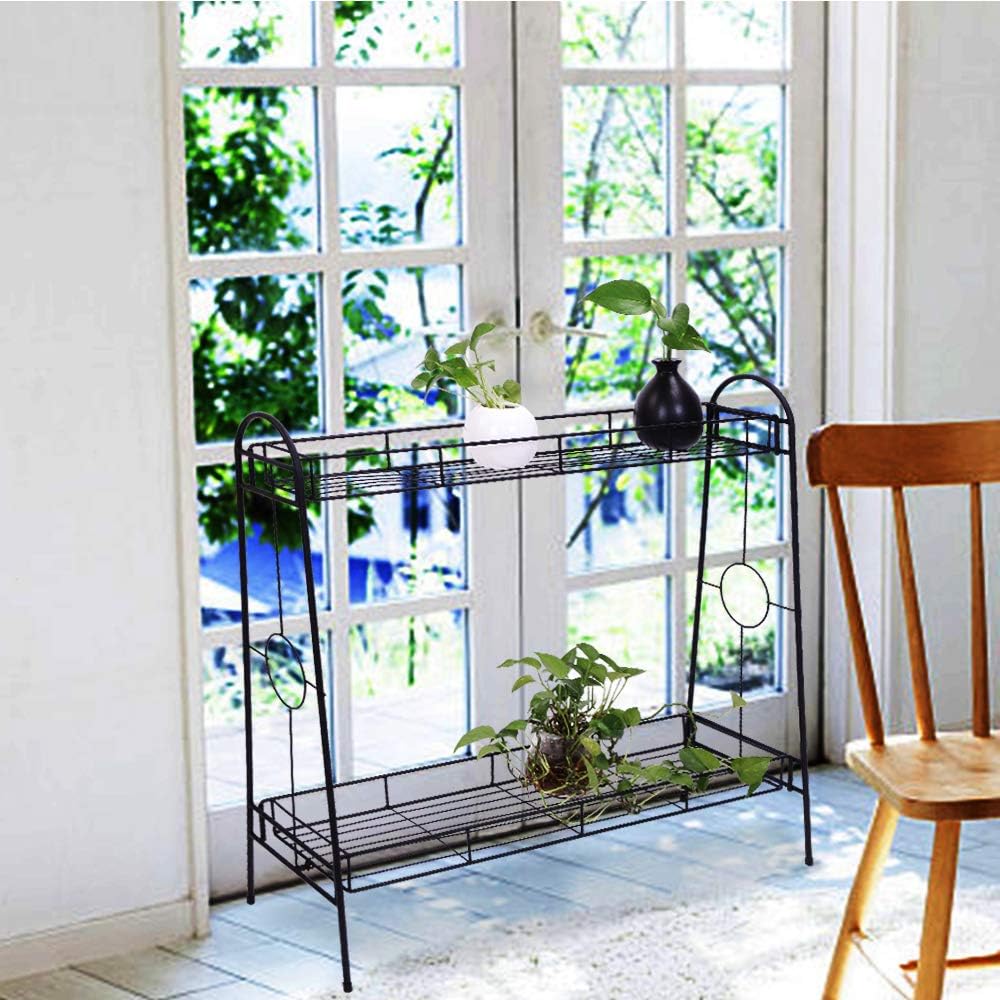 Do you like this brand new and high quality 2-tier standing plant shelf? 2 layers of round pattern plant shelf adopts contemporary tray adorn design,supports two or three plants per tier. powder coated finish will last for years. This plant pot stand is made of metal, which made it more durable. Exquisitely carved designs decorate your garden, pots and make people notice your flower. These attractive plant stands can be used on balconies, hallways, kitchens or bathrooms to decorate dull spaces. Beautiful things bring you good mood. What are you waiting for? It will not let you down. Features: 1. Brand new and high quality 2-tier standing plant stand 2. Contemporary tray adorn design 3. Great for indoor or outdoor use 4. Supports two or three plants per tier 5. The two levels enhance the versatility of this piece 6. Powder coated finish will last for years 7. Steel construction for durability Specifications: 1、Size: (32.7 x 12.2 x 32.1)" (W x D x H) 2、Gross Weight:6lb / 2.7kg 3、Material: Wrought iron 4、Color: Black 4、Style: Fashion and Simple 5、Charactor: Durable and rust-resistant 6、Maintenance Instructions: Full cloth piece with a neutral detergent scrub and then wipe dry with a dry cloth Package Includes: 1 x 2-tier standing plant stand