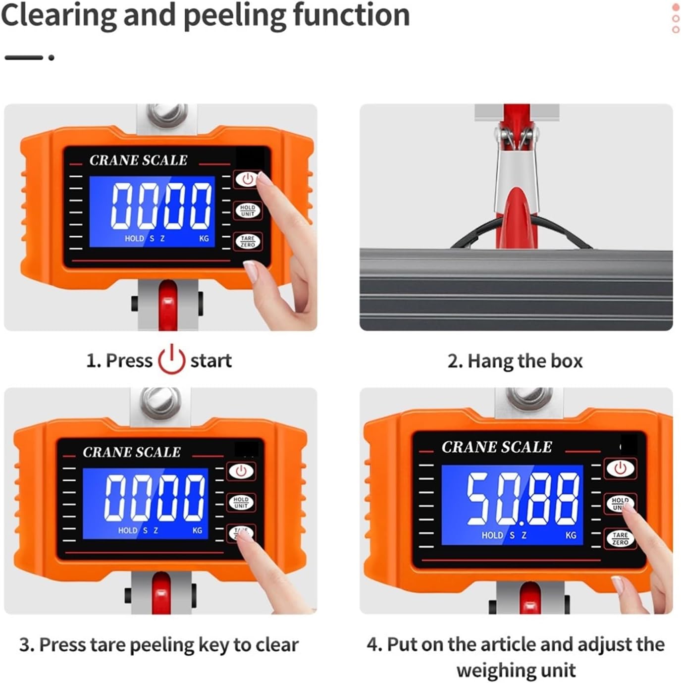 Features Aluminum die-casting case LCD display with backlight Stainless steel shackle Specification Accuracy class OIML III Tare range 100%F.S. Zero range 4%F.S. Safe overload 120%F.S. Overload alarm 100%F.S.+9e Battery life >100h Temperature range -10~40 Functions Zero Battery supervision Tare Overload alarm Hold Unit switch Auto power-off