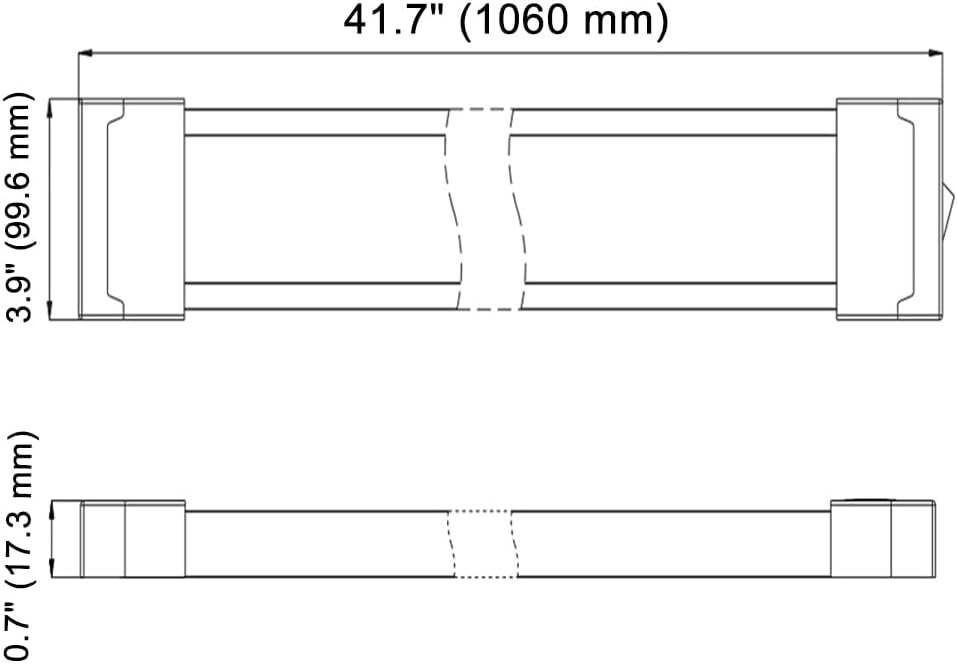 Specifications: Wattage: 36 Watt per Light Voltage: 12V/24V DC Current Draw: 2550 mA@12V, 1270 mA@24V Switch Type: Integrated On/Off Rocker Switch Color Temperature: Cool-White Finish: Grey Working Temperature: -40℃ ~ +50℃ Connection Type: Hardwired Housing Materials: Aluminum Lens Materials: Polycarbonate Lens Color: Clear Power Wire Length: 15.7 in. (40 cm) Wire Gauge: 20 AWG Lumen Output: 3600 lm Waterproof Rating: Non-Waterproof Product Type: Interior Light Net Weight per light: 3.08 lbs. (1.40 kg) Product Height: 0.68 in. (17.3 mm) Product Length: 41.73 in. ( 1060 mm) Product Width: 3.92 in. (99.6 mm) Quality Warranty: 2 YearsSafety & Notes: 1. The light is the low voltage LED lights primarily designed 12-24 VDC mobile lighting. When installed for household, it is strongly recommended to be processed by professional electrician in strict accordance with the safety standard. 2. For your safety, please cut off the power source before performing any installation or wiring procedures. 3. When lights illuminated, direct eyes exposure to the LED light beam need to be avoided. 4. Power button is rocker switch for on & off control 5. Indoor or cabin use only. Without immerse in the water. Installation Instructions: 1. Remove two endcap screws to access mounting holes. 2. Mount LED fixture to surface using 4 mounting screws, and then replace endcaps. 3. Connect RED wiring to Positive, and the WHITE to Negative