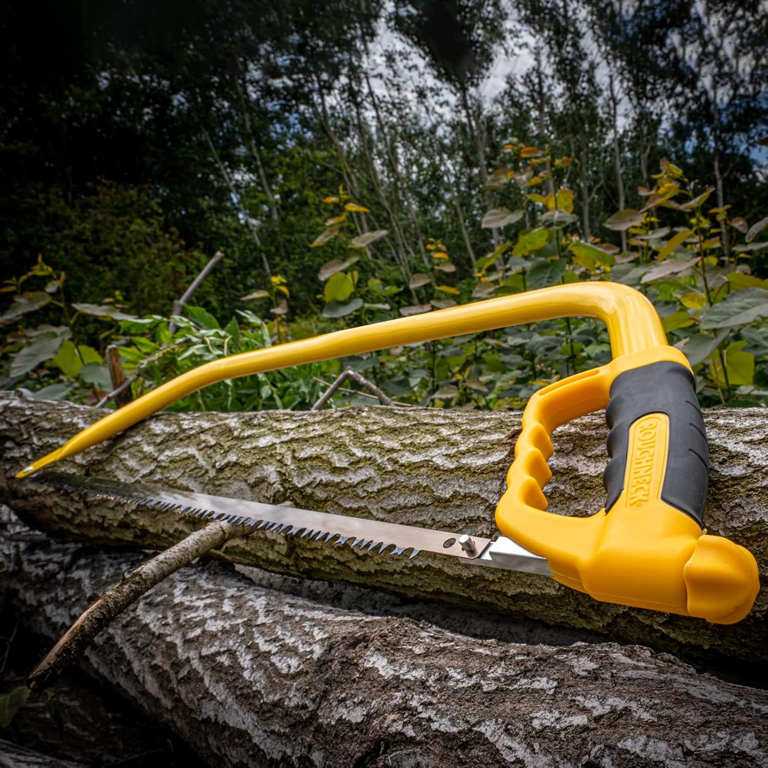 Product Description Roughneck Bow Saws have a heavy duty, thick steel frame to provide excellent strength and rigidity. Featuring tough blade fixings and easy blade tensioner for high blade tensioning and rapid blade changeovers. An ergonomic comfort grip handle with knuckle guard provides hand protection. Supplied with raker tooth blade for cutting green wood (peg tooth blade for cutting dry wood also available). Set Contains: 1 x Roughneck Bow Saw 530mm (21in)
