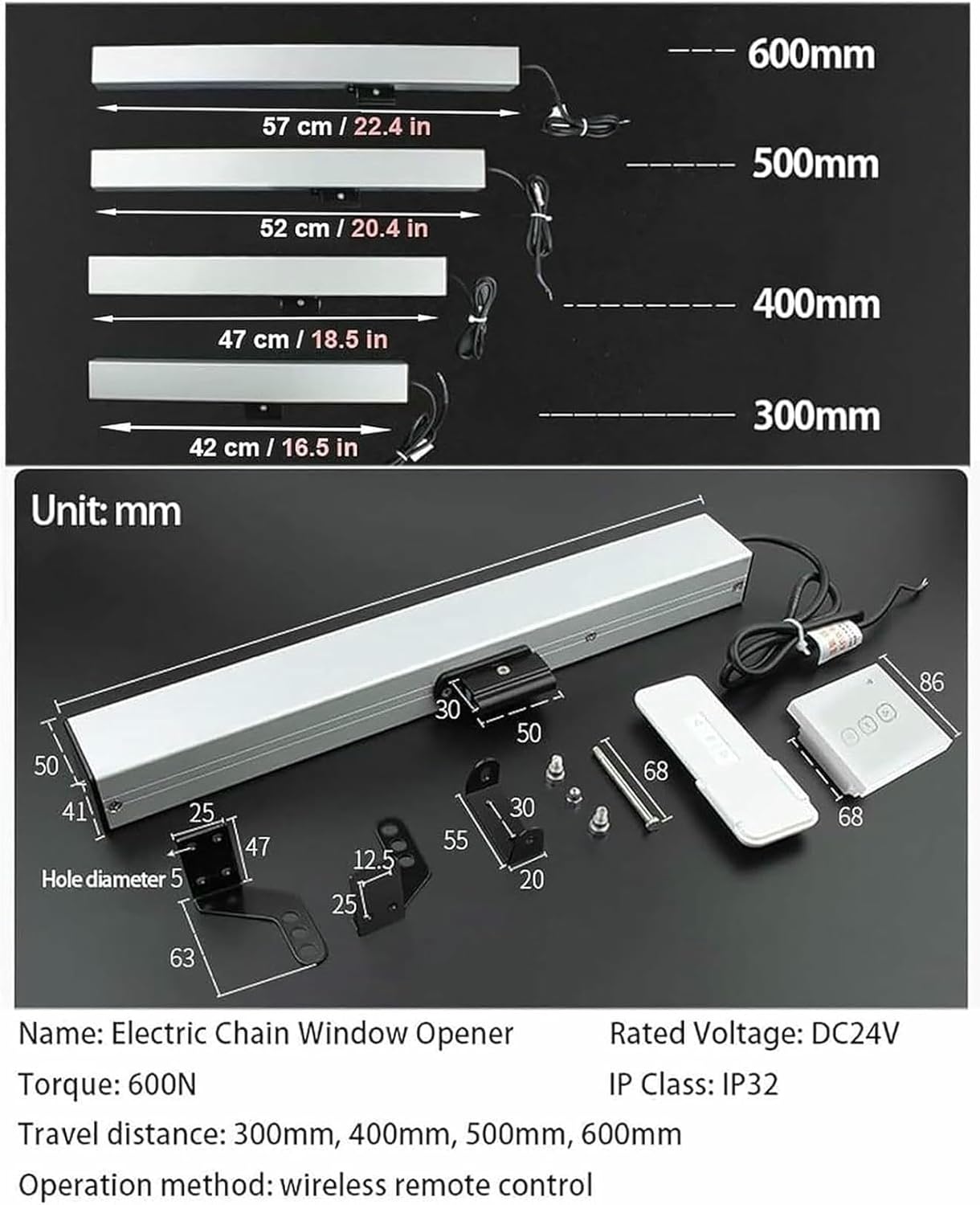 SpecificationsName: Chain Electric Window OpenerMaterial: Aluminum AlloyProduct Torque: 600NStroke: 300mm, 400mm, 500mm, 600mm, 700mm, 800mm, 1000mmPacking List:1 * Window Opener1 * Remote Control1 * Rain SensorRemarks:1. The color of this product may be slightly different from the picture due to different light and lighting2. Please allow 0~2 cm error due to manual measurement. Thank you for your understanding