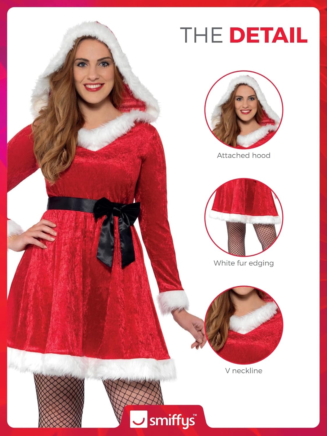 The Smiffys Curves Miss Santa Woman's Costume Includes Red Dress with Belt. Tights and Shoes Not Included. Please note that all our Smiffys products will always come in full Smiffys branded packaging.