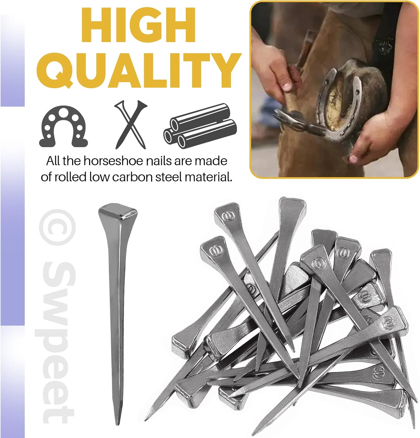 🏆Swpeet 130Pcs 5 Sizes E2 E3 E4 E5 E6 Steel Horseshoe Nails Assortment Kit, 1.6"" 1.7"" 1.8"" 2"" 2.1"" Horse Hoof Nails Horseshoe Tools Fix Horse Nail Palm for Horse Race Horse Horse Training 🏆 Why Choose Us? 🎖 1. Easy To Use ⛳ Precisely manufactured to provide the best elasticity while maintaining the strength of the material, making the horseshoe nail easy to use, save time and energy. 🎖 2. High Quality ⛳ Constructed of high‑quality steel and undergoes a strictly controlled rolling process for high tensile strength. These nails are used in nail palm for horse, with better performance and high reliability. 🎖 3. Strong Adapbility ⛳ Sufficient quantities of horseshoe nails with different sizes can meet your different replacement needs. Perfect for horse training, riding, equestrian sporting, horse racing, etc. 🏆 Specifications: ⛳ Material: Stainless Steel ⛳ Color: Sliver ⛳ Sizel: E2-1.6Inch/4.1cm, E3-1.7Inch/4.5cm; E4-1.8Inch/4.75cm; ⛳ E5-2Inch/5.1cm; E6-2.1Inch/5.4cm 🏆 Package Includes: ⛳ 30Pcs --------------- E2-1.6Inch/4.1cm Horseshoe Nails ⛳ 30Pcs --------------- E3-1.7Inch/4.5cm Horseshoe Nails ⛳ 30Pcs --------------- E4-1.8Inch/4.75cm Horseshoe Nails ⛳ 20Pcs -------------- E5-2 Inch/5.1cm Horseshoe Nails ⛳ 20Pcs --------------- E6-2.1Inch/5.4cm Horseshoe Nails ⛳ 1Pcs ---------------- Storge Box ⛳ In Total: 131Pcs