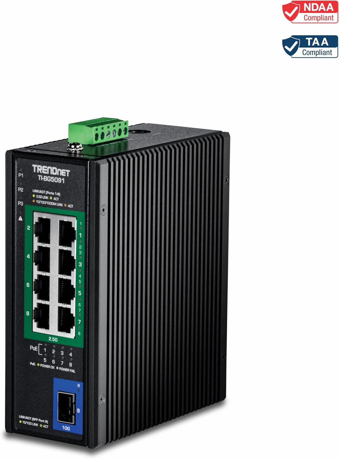 TRENDnet's 9-Port Industrial 2.5G DIN-Rail PoE++ Switch with 10G SFP+ Port, model TI-BG5091, delivers network connectivity to rugged environments, while saving you on installation costs and setup time using Power over Ethernet technology. The industrial PoE++ switch features a rugged IP50 rated metal enclosure, designed to withstand a high degree of vibration and shock, while operating in both high and low temperatures for industrial environments within -40° – 75° C (-40° – 167° F). This hardened industrial PoE++ switch features eight 2.5G PoE++ ports, and a 10G SFP+ port for long-distance fiber networking applications. Installers and integrators can save on equipment costs and reduce installation time with TRENDnet's Industrial Multi-Gigabit PoE++ DIN-Rail Switch by delivering up to 95W per port of PoE power and data over existing Ethernet cables. Fast PoE minimizes wait time for PoE devices by providing power immediately at boot up. With PoE technology inside this industrial PoE++ switch, users only need one cable to deliver both data and power. Easily network PoE devices to this hardened industrial PoE++ switch, such as highpower wireless access points, IP cameras, VoIP phone systems, IPTV decoders, and access controls