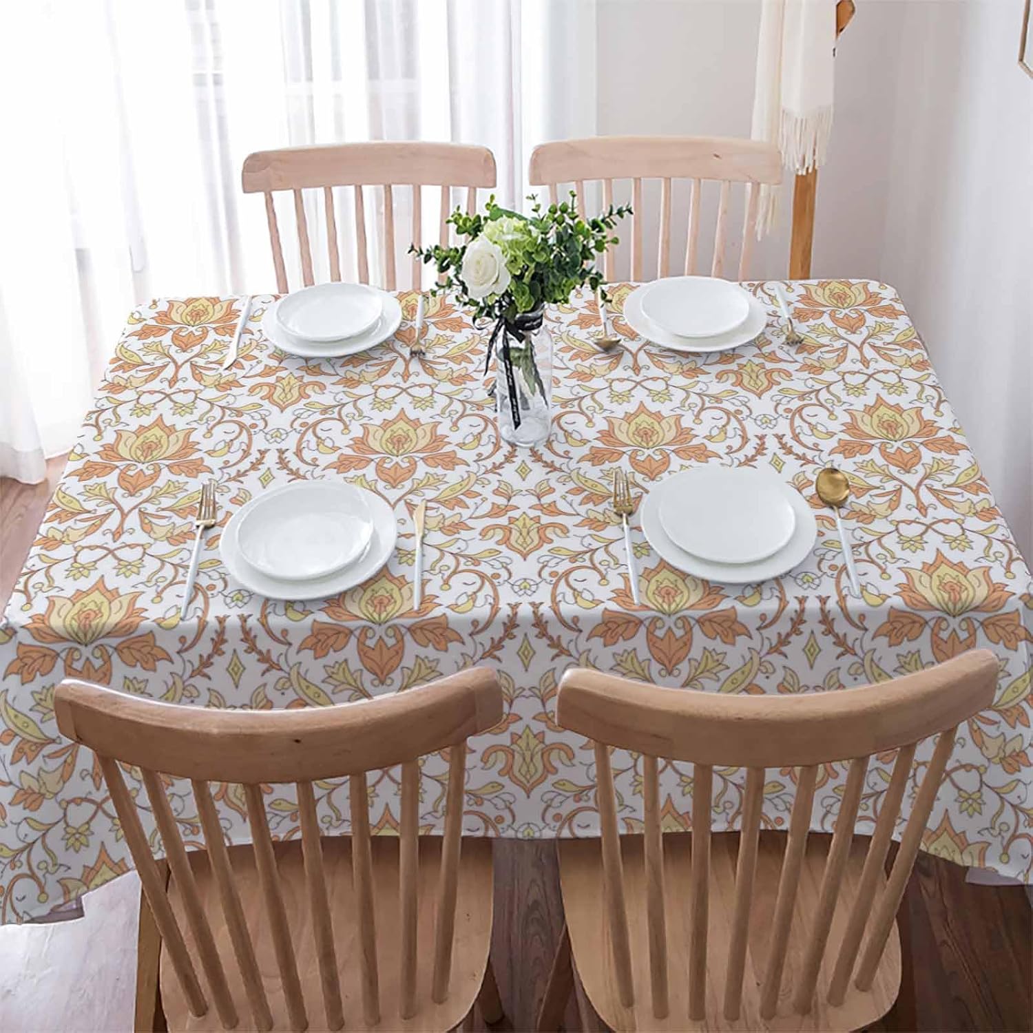 Are you looking for baby shower tablecloth/banquet tablecloth/baptism tablecloth/BBQ tablecloth/birthday party tablecloth/picnic tablecloth/camping tablecloth/farmhouse tablecloth/outdoor tablecloth/indoor tablecloth/fiesta tablecloth/summer tablecloth/rustic tablecloth/decorative tablecloth?Please look at our outstanding tablecloth, which help you solve daily spill, stain, scratch problems, but also add some extra bonus.** Excellent StructureOur table cloth consists of 3 layers:--The top layer is a waterproof, stainproof, oilproof, spillproof polyester coating;--The middle layer is a exquisite high definition pattern;--The last layer is a soft cotton linen lining.** Exquisite WorkmanshipThis tablecloth is made by skilled artisans with fine stitching. The hem is designed with folded border and fine stitching to ensure elegant looking and no loose threads.** Stain & Water & Spill ProofThis smooth and durable tablecloth is made of premium polyester fabric with stain-proof, water-proof and spill-proof treatment. All liquids bead up for easy cleaning, no leaks, can use for a long time!HOW TO CHOOSE A SUITABLE TABLECLOTH?** Tablecloth Length=Table Length + Drop Length x 2;** Tablecloth Width: Table Width + Drop Length x 2.** 54x54 Square Tablecloth Fit for 2-4 persons(2-4 FT Tablecloth)** 60x60 Square Tablecloth Fit for 2-6 persons(2-6 FT Tablecloth)** 52x72 Rectangular Tablecloth Fit for 2-4 persons(2-4 FT Tablecloth)** 52x108 Rectangular Tablecloth Fit for 4-6 persons(4-6 FT Tablecloth)** 60x84 Rectangular Tablecloth Fit for 4-6 persons(4-6 FT Tablecloth)** 60x102 Rectangular Tablecloth Fit for 6-8 persons(6-8 FT Tablecloth)** 60x120 Rectangular Tablecloth Fit for 6-10 persons(6-10 FT Tablecloth)Upon arrival there are folds, which is normal. Hang it up, iron in low temperature, or threw them all in the dryer! The wrinkles will disappeared.