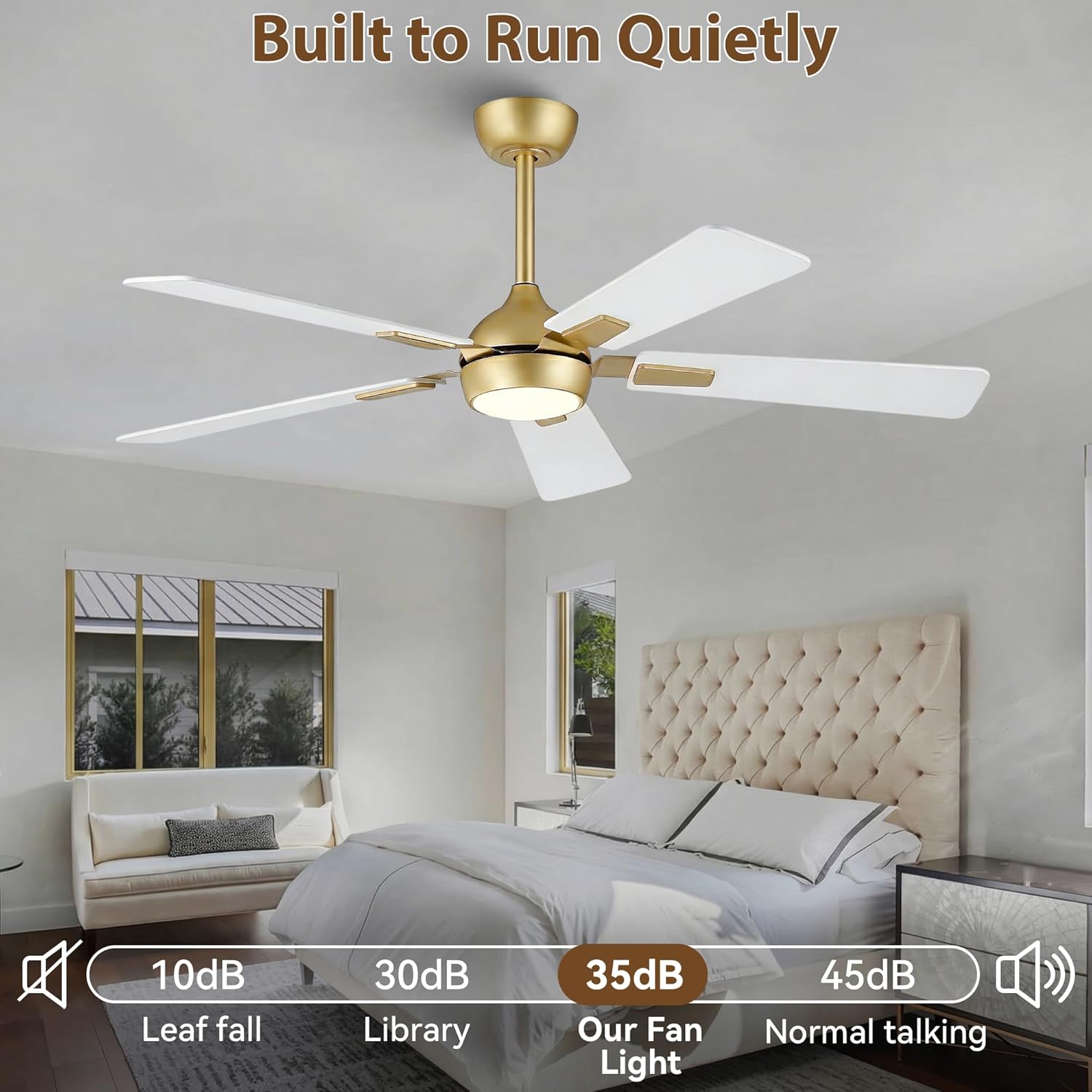 This 52 inch white ceiling fan with light is designed for homeowners who want a clean, modern look without paying a premium price. The combination of a gold motor housing and white blades creates a bright, minimalist style that enhances both small and medium-sized rooms. With a quiet DC motor, adjustable airflow, and integrated LED lighting, this ceiling fan offers everyday comfort and functionality. The reversible motor and energy-efficient design make it suitable for year-round use, while the smart remote and APP control add convenience to daily life. As a value-focused modern ceiling fan with light, it’s an ideal choice for bedrooms, living rooms, and contemporary interiors seeking both style and practicality.