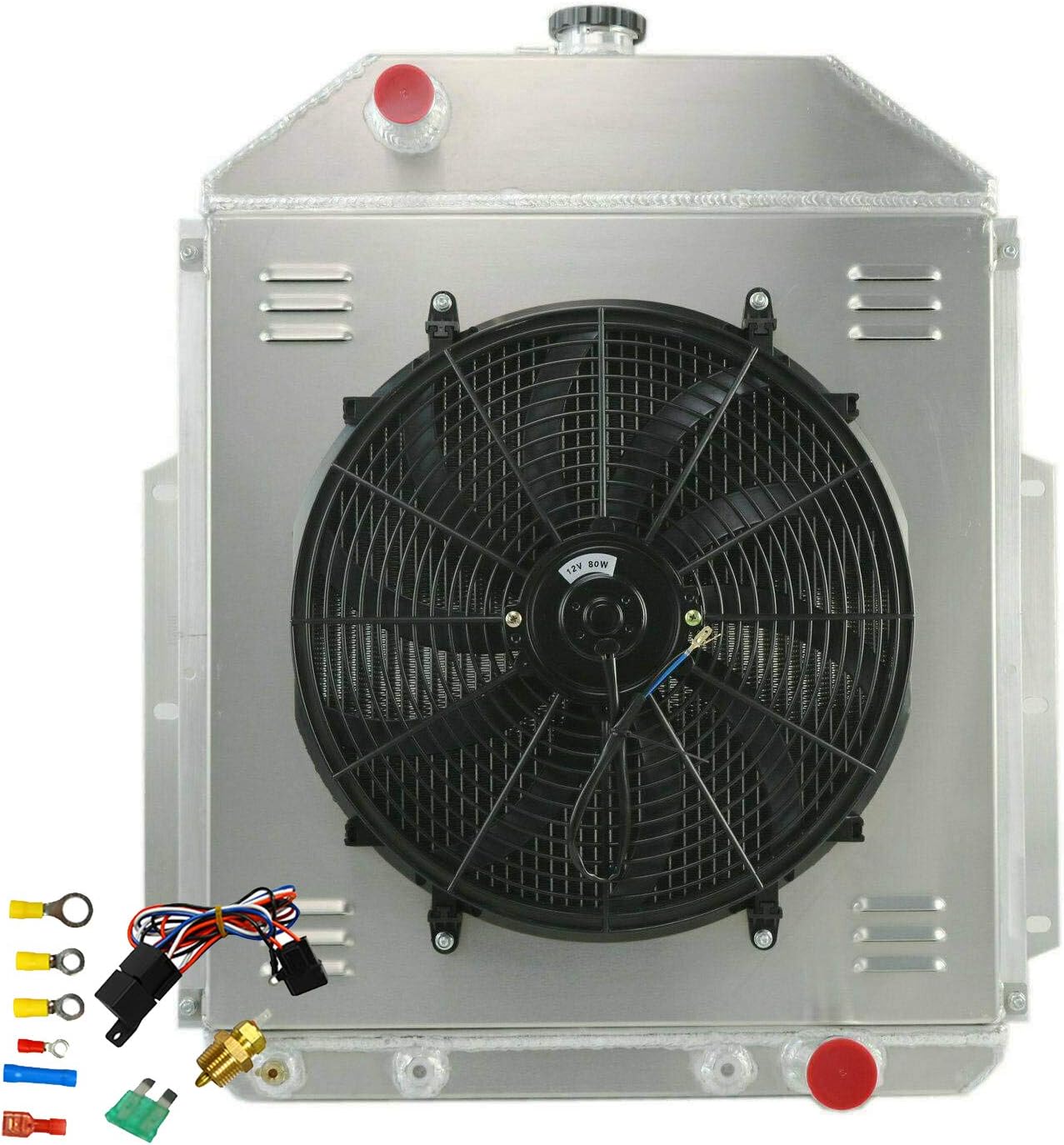THIS LISTING INCLUDES THE RADIATOR & SHROUD & ONE 16" FANS & THERMOSTAT KITS! Radiator Size: Row: 3 Row Core Material: Full Aluminium Radiator Cap: included Core and Tank: All Aluminum Core Dimensions (H x W): 21 1/2 x 20 7/8 Overall Dimensions (H x W): 27 5/8 x 24 3/4 Hose Locations: IN: Driver / OUT: Passenger Hose Fittings: IN: 1 1/2 - OUT: 1 3/4 Trans Cooler Details: 1/2-20 Straight Thread, G 1/4 Mounting Type: BRACKET MOUNT CNC machined filler neck and cap Aircraft 5057 grade aluminum and with raw aluminum finish OEM style brass petcock drain. Vehicle Fitment: For Ford F-Series F1 F2 F3 Pickup V8 GAS 1942-1952 FANS: Maximum Fan CFM: 1730 cfm Fan Diameter (in): 16.050” Thickness (in): 2.500” Number of Blades: 10 blades Maximum Fan RPM: 2,250 rpm Blade Material: Plastic Amp Draw: 12.70 amps Includes the Mounting Tabs for an Easy Zip Tie Installation Thermostat Kit: Universal fit for any automotive vehicle and electric fan. Activates by grounding electric fans at preset temperature. 180'F turn-on temperature, 165'F turn-off temperature. 3/8" NPT thread-in brass probe w/ 1/2" NPT adapter included. Probe typically threads into radiator, water outlet or manifold.