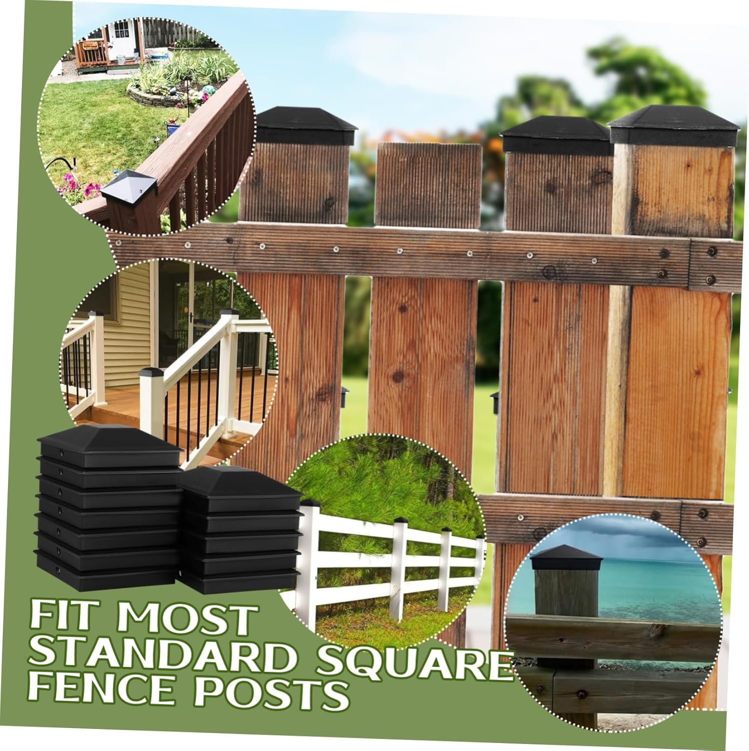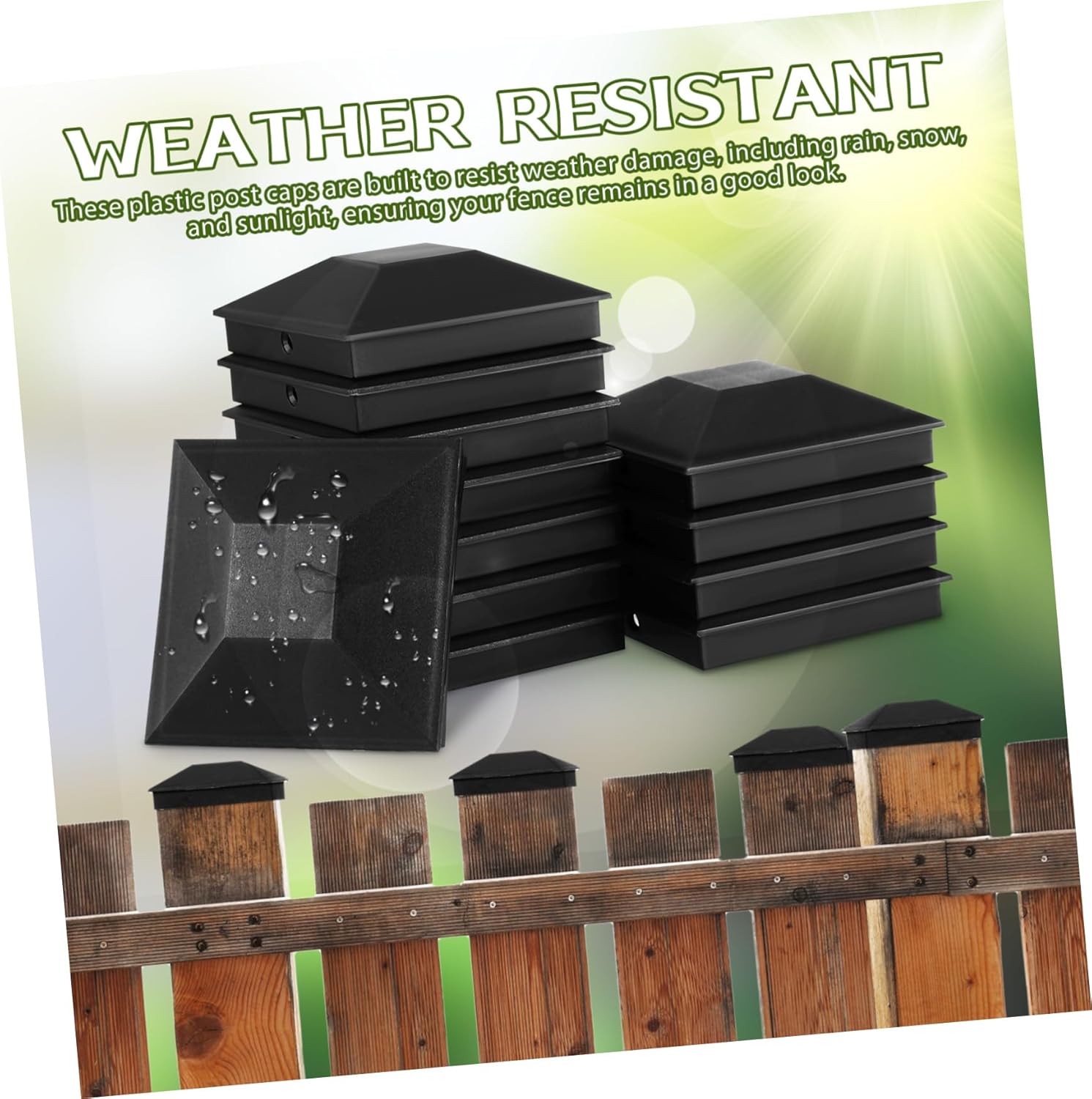 Package Include 48 x post caps 96 x screws Characteristics - build: Constructed from resilient and hard-wearing plastic, these fence post toppers are made to endure environmental factors lastingly Outdoor Post Covers. -Outdoor : Resilient against various outdoor , such as rain and sunshine, these post caps preserve the integrity and visual appeal of your fencing keep. -Size:9.00X9.00X3.00cm/3.54X3.54X1.18in post -Stylish upgrade: The streamlined design of our fence post covers delivers a refined and harmonious appearance to fencing, elevating the light solar powered caps. -Material:Plastic cover -Color:Black Post Caps For Porch -Simple mounting: Accompanied by screws, these desk post caps ease the installation process; just screw them on your fence pillars for an immediate enhancement fence post covers. -Ideal compatibility: These fence post protectors fit conventional posts, offering adaptable utility, compatible with most fence designs fence post finials.Goods Descriptionfence capping These caps are crafted from weather-resistant plastic, ensuring they withstand harsh outdoor conditions while protecting your fence posts.Guardrail Caps Upgrade your fence with these sturdy plastic fence post caps, complete with screws for a secure fit.fence toppers Easy to install, these caps not only enhance the appearance of your fence but also contribute to its longevity and durability