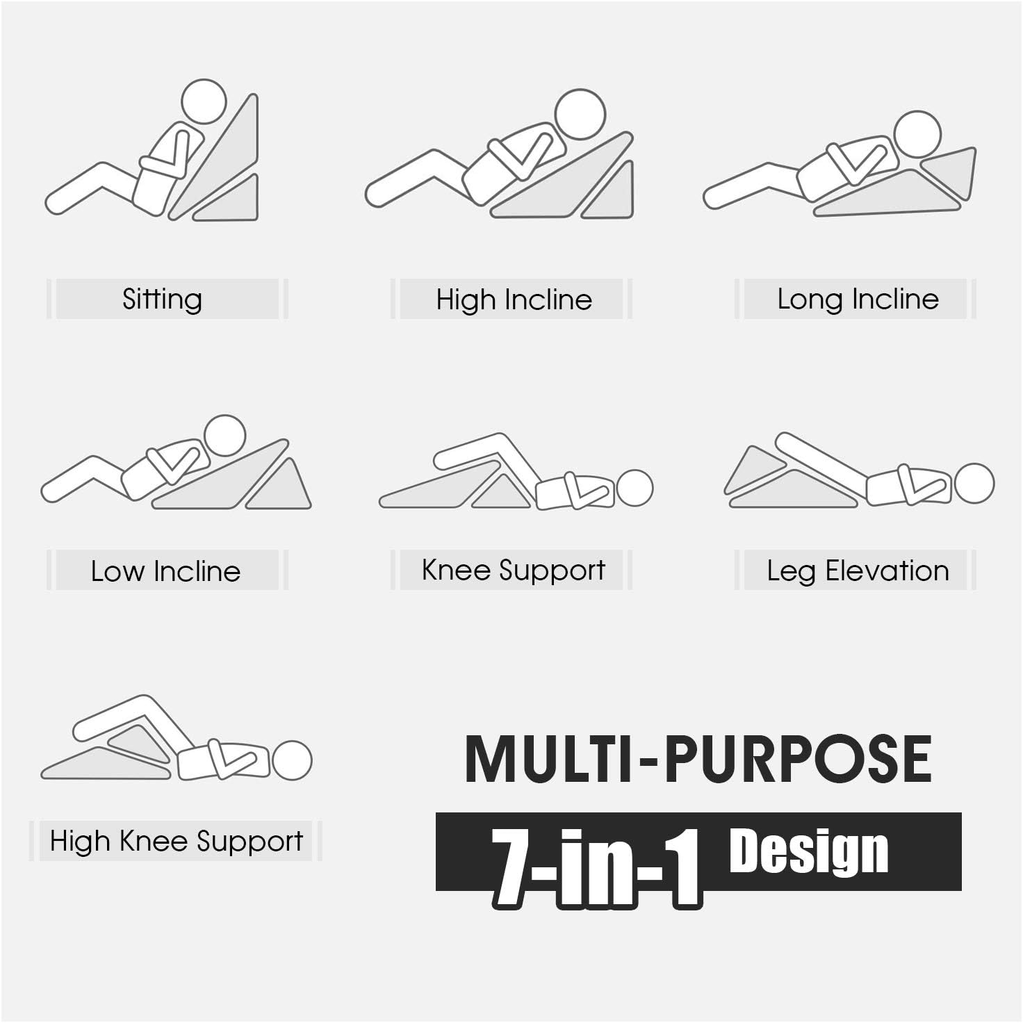 Description:This 7-in-1 multipurpose bed wedge is a perfect choice for people who have sleeping problems, sour waist or leg pain.The ergonomic design with appropriate tilt angle perfectly conforms to the curve of the body to provide optimal comfort for your head, neck, back, legs or knees. Besides, convertible design ensures multiple-level incline to meet different needs of comfort.As for the quality, this bed wedge pillow is made of 40D memory foam and 25D high resilience sponge, which provides great comfort and is not easy to collapse. The sofa flannel cover is removable and washable with smooth zippers. In addition, the bed wedge comes with a convenient carrying handle for easy transportation. And you can use this cushion, whether in bed, sofa or the floor, to have a cozy leisure time!Features:Thick cushion is filled with high resilience sponge and memory foam7-in-1 convertible design to meet different needs of comfortErgonomic design with proper tilt angle to relieve your discomfortThe soft flannel surface provides a skin-friendly touch and comfortEasy to take off and clean with the zippered and washable coverMulti-purpose pillow to offer support for your head, legs and kneesThe convenient carrying handle makes it easy to move around Hook and loop fasteners on the both side help to fix the pillowSpecifications:Color: GreyMaterial: 25D Sponge, 40D Memory Foam, FlannelProduct Dimensions: 23" x 20" x 14"(L x W x H) Net Weight: 5 lbsPackage includes: 1 x Bed Wedge PillowWhy You Choose Our Bed Wedge?√Convertible design meets various needs in daily use√High resilience sponge and memory foam provide optimal comfort