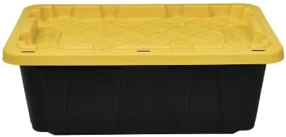 This heavy-duty 14-Gallon Tough Tote is crafted to meet all your storage needs. Constructed with a sturdy black base made from high-grade resin and a secure yellow snap lid, this tote ensures the safety and protection of your belongings. It is designed for the meticulous organizer in search of premier storage solutions, featuring integrated slots for locking to prevent unauthorized access. Additionally, its unique tie-down channels make it effortless to secure for trouble-free transport and it is compatible with most hitch mounted cargo carriers. The gallon size is clearly visible on both the base and the lid for easy identification. The tote has a weight capacity of 75 lbs and comes as a part of a range of sizes from 7 Gal. to 77 Gal.