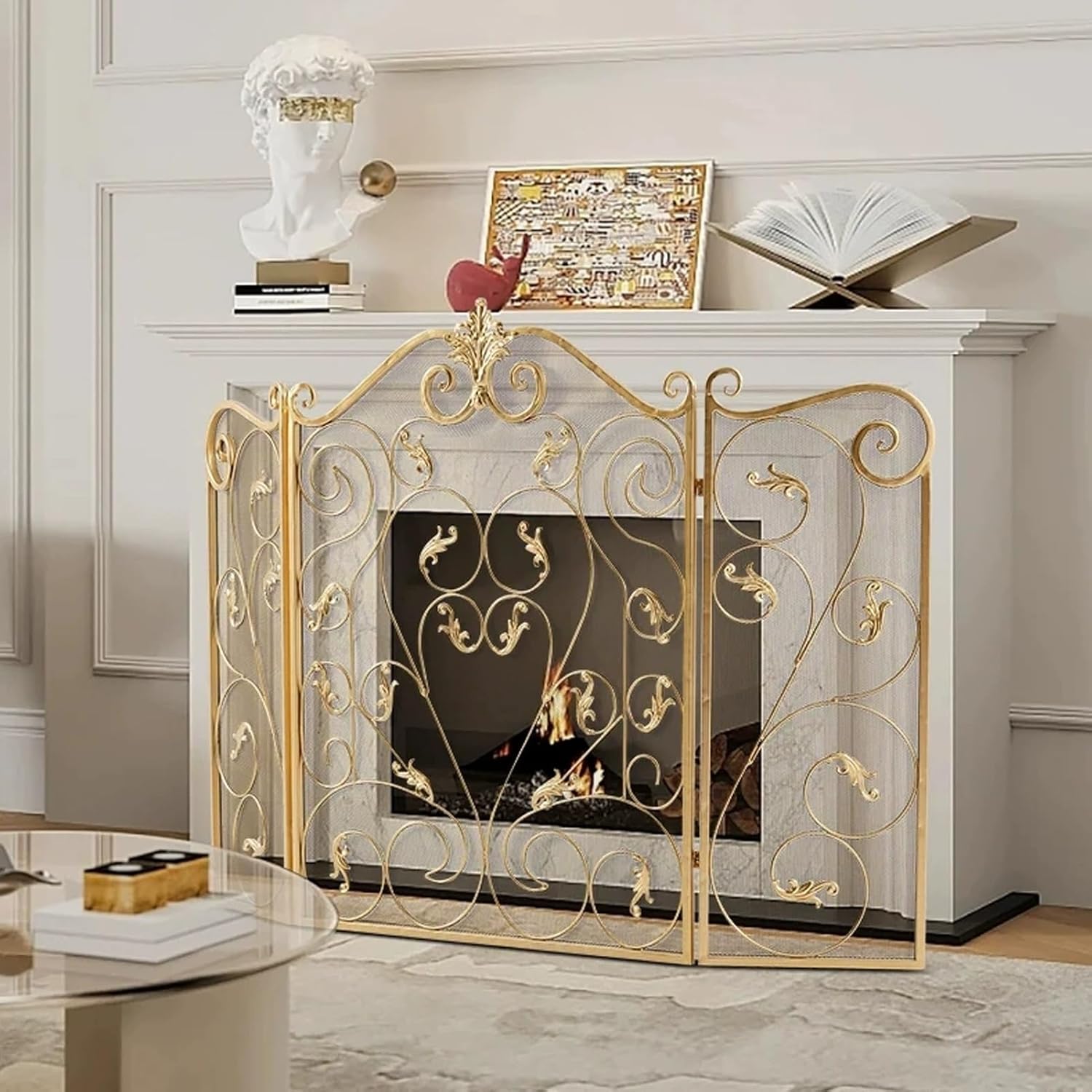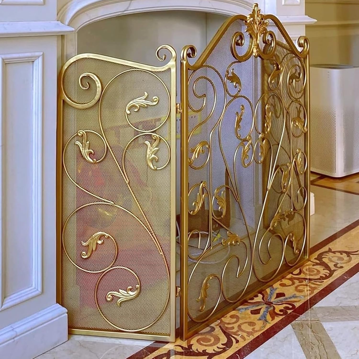 JKGHK Foldable 3-panel fireplace screen features welded metal bars creating a latte art pattern on top of a mesh background, with a hinge mechanism between frames attaching the panels together. Add style and charm with this protective mesh screen covering your fireplace or empty wall to eliminate negative space, or try placing it in front of a candle cluster to recreate a warm and homey feel. Name: Spark Fire Guard/Stand Alone Cover/Fireplace Spark Guard Mesh/Stand Cover/Fire Place Screen/Fire Accessories/Screen Mesh/Fire Place Standing Gate FenceProduct Material: MetalColor: GoldSize: (91.5cmX71cmX30.5cm)/ (36inX27.9inX12 in)Product function: It can block the embers from open fire and firewood.Scope of use: indoor fireplaces, outdoor bonfires, wood stoves, outdoor grills, etc.Package Content:- 1 x Fire Spark Guard CoverNotice:1.Because it is processed by hand, the finished product usually has an error of 1-2 cm, please understand.2.Due to the light and screen setting difference, the item's color may be slightly different from the pictures.3. We only have Fire Spark Guard Cover, other products are only used as scene props for reference.