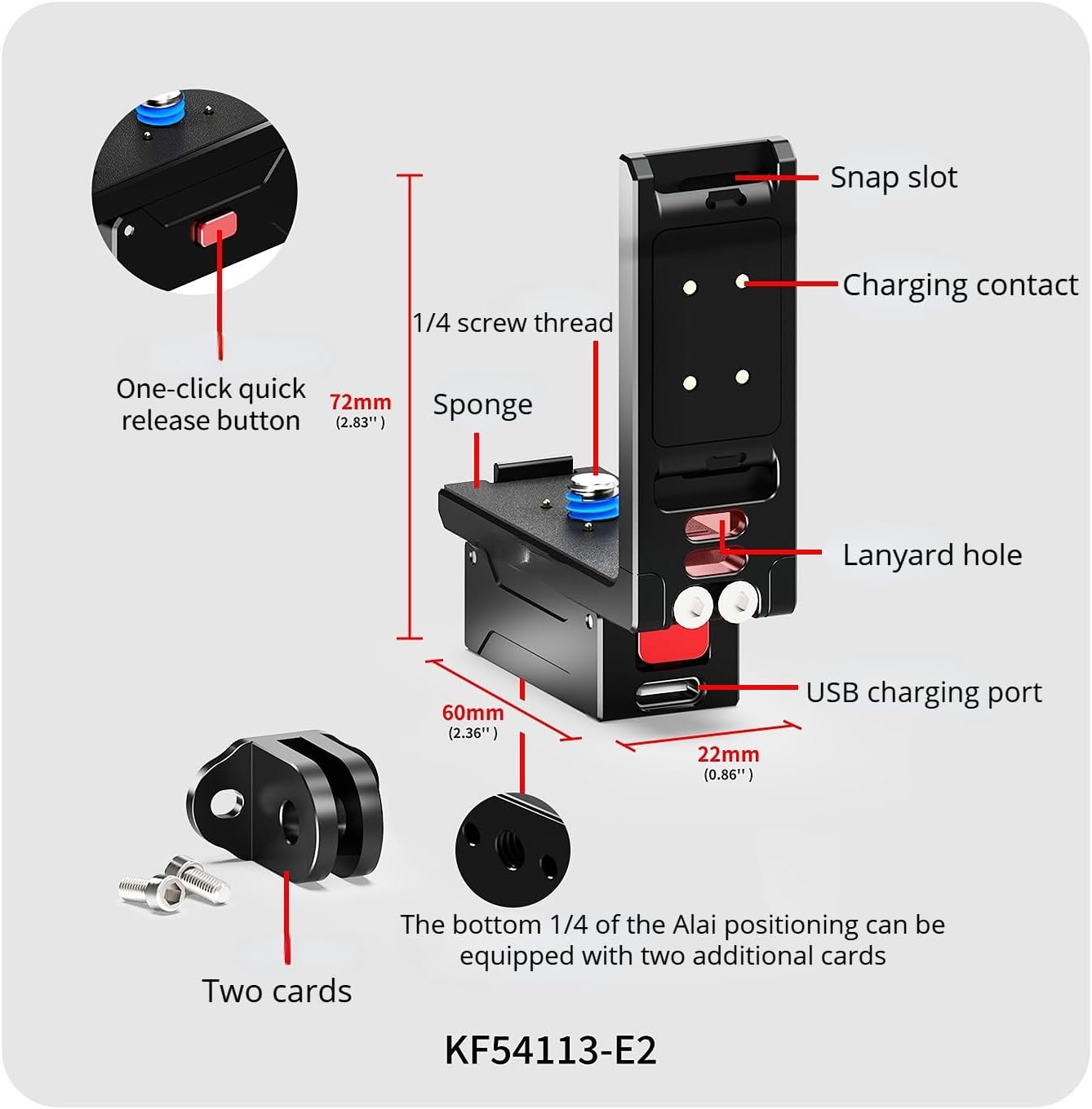 A L-shape bracket adapted for OSMO 360, combining magnetic quick release and multi-version functions; available in 2.24 x 0.87 x 2.36 inch and 2.83 x 0.87 x 2.36 inchWhy Choose It?1. Magnetic Quick Release: The bracket uses N52 strong magnet, enabling fast attachment and detachment for OSMO 360 during shooting.2. Vertical & Horizontal Shooting: It supports instant orientation switching, expanding creative shooting options for OSMO 360.3. Multi-Version Options: Choose charging contact, basic, or upgraded expandable versions to match OSMO 360's different usage needs.4. Sturdy Aluminum Material: The alloy bracket offers reliable durability, fitting OSMO 360 during outdoor activities.5. Expandable Compatibility: The upgraded version works with tripods or selfie sticks, enhancing versatility for OSMO 360.Who It’s For?1. OSMO 360 Owners: Those needing a magnetic quick release bracket to enable vertical/horizontal shooting for their action camera.2. Content Creators: Vloggers or outdoor shooters requiring charging-compatible or expandable brackets for OSMO 360.