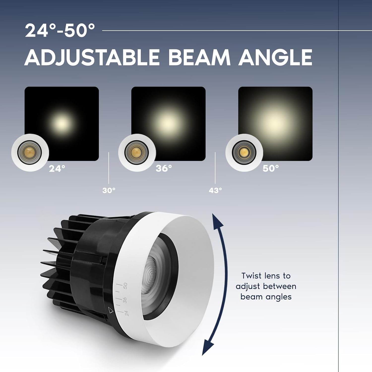 | Other Special Features of the Product | Adjustable 24°–50° Beam Angle, CCT Select Switch, Dual Dimmable (TRIAC/0-10V), IC Rated, Trimless Design |