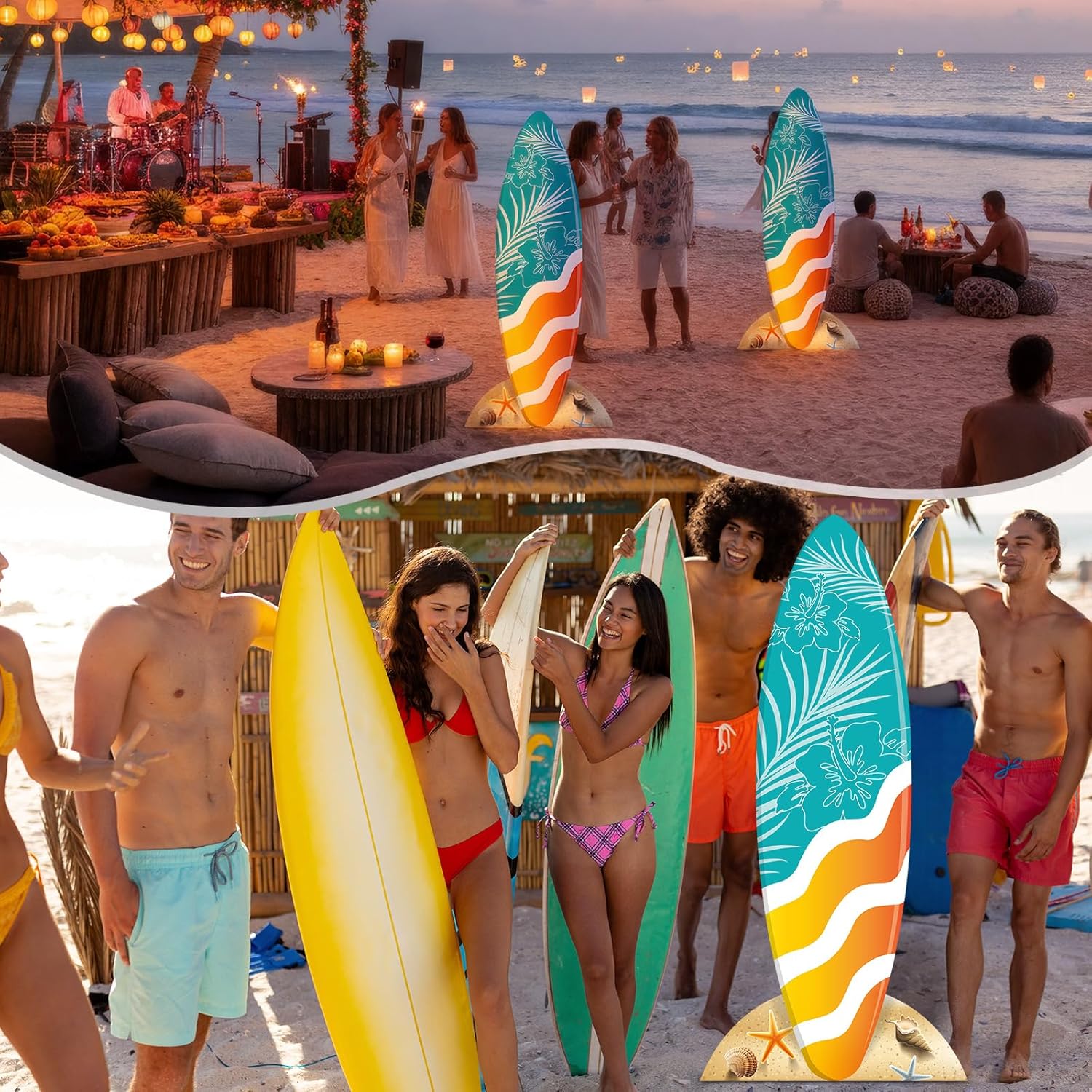 Features: Vibrant tropical wall decoration: As a sizable tropical beach wall decoration, its vividly printed front contrasts with the plain white back. Its sturdy and water-resistant build allows for both indoor and outdoor use, instantly transforming any space. Be the visual centerpiece: Place this large surfboard cutout cardboard stand at your event to instantly create an attractive focus. Its impressive visual impact ensures an immersive and memorable experience for all your attendees. Specifications: Material: plastic hollow board Color: orange, blue, white Size: about 6 ft x 34 inches/ 182 cm x 86 cm Package includes: 1 x Surfboard Notes: Manual measurement, please allow slight errors on size. The color may exist a slight difference due to different screen displays