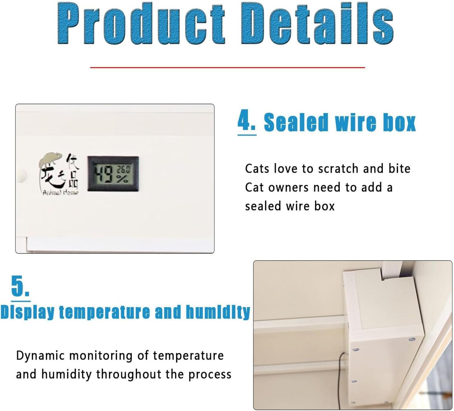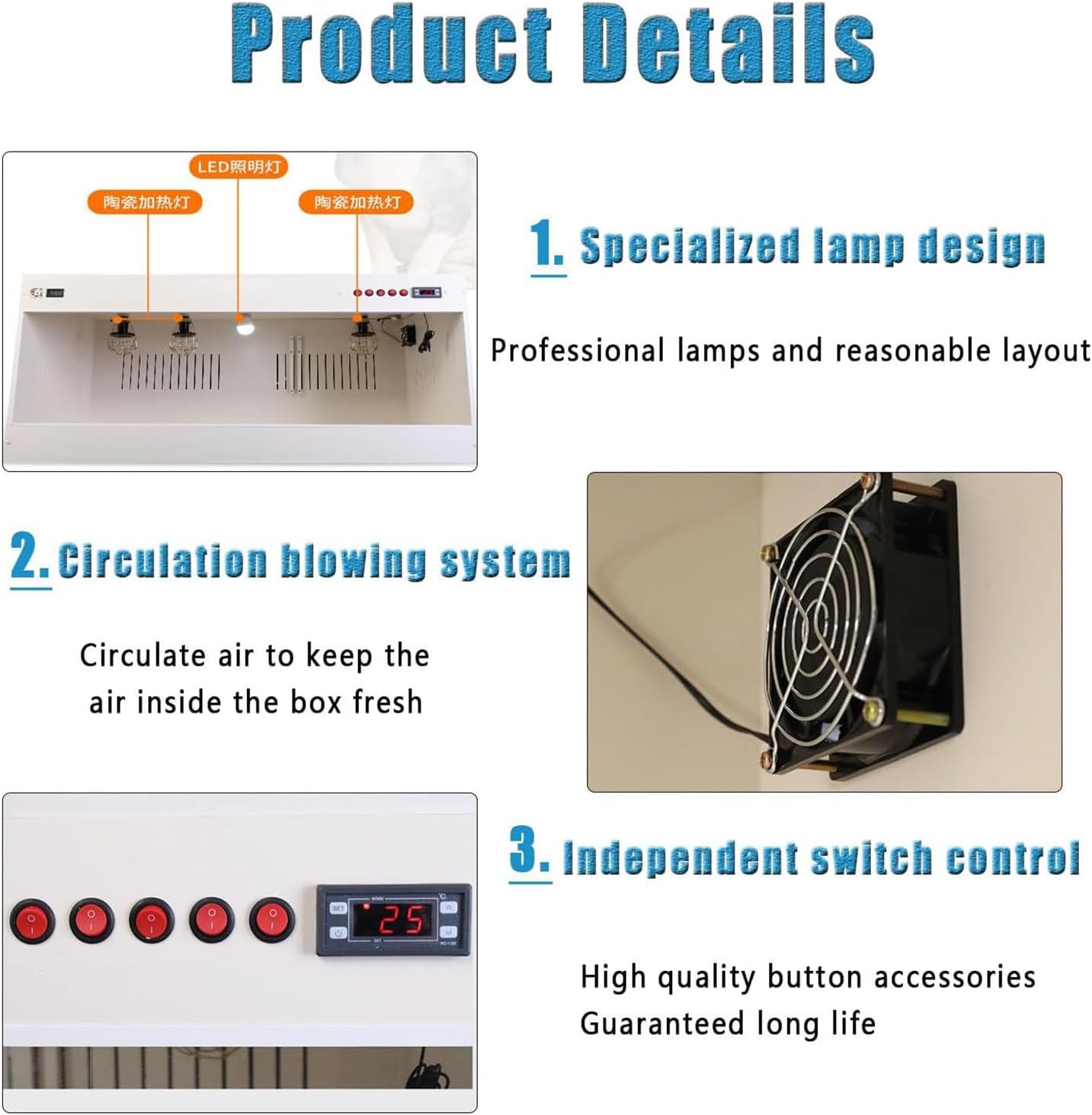 Puppy Cat Incubator Provides a clean, warm and comfortable living environment, ensures sufficient breast milk and prevents puppies from frostbite. This is a perfect incubator. Take it home quickly!Features:- LED lighting, ceramic heating lamp, equipped with professional lamps, reasonable layout.- Special lamp tube design, more environmentally friendly, sealed metal box to prevent cats from scratching and biting.- Dynamic monitoring of temperature and humidity throughout the process, intelligent constant temperature adjustment, successfully improve the survival rate.- Circulating air keeps the air in the box fresh, and multiple vents ensure exhaust. The puppy incubator has independent switch control and is easy to use.Specifications:Product Name: Puppy Cat IncubatorVoltage: 220 VVolume (Package Size):60 x 50 x 50 cm / 23 x 20 x 20 inches (64 x 54 x 25)80 x 50 x 50 cm / 32 x 20 x 20 inches (84 x 54 x 25)100 x 60 x 60 cm / 39.3 x 23.6 x 23.6 inches (104 x 64 x 20 inches)Net Weight: 16 kg / 20 kg / 34 kgPackage Included:1 x Puppy IncubatorWe sell quality products at the best price and excellent service. Your questions will be answered within 24 hours. If you have any questions, please feel f ree to contact us.