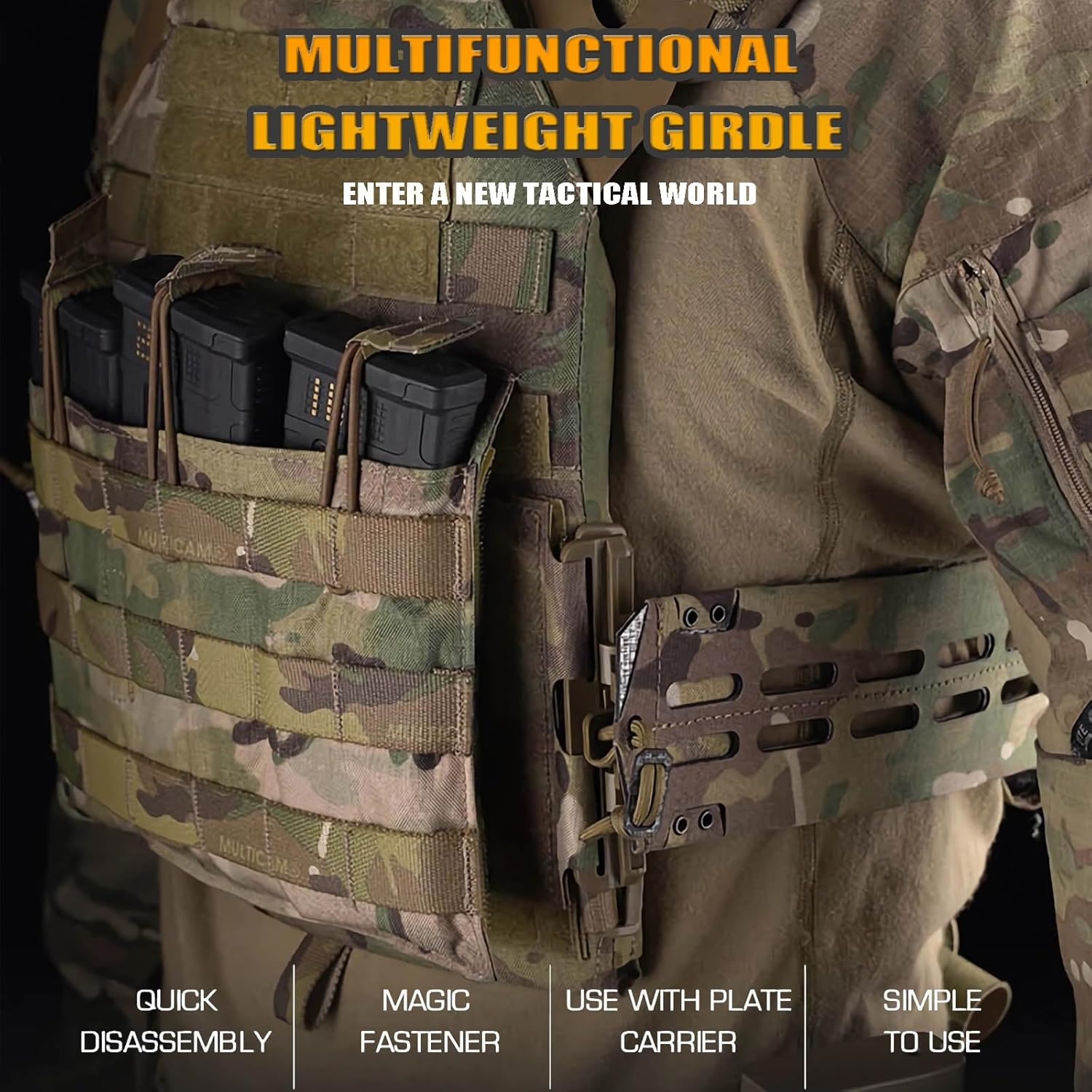 Main Material:Nylon Fabric + Elastic Webbing + ABS Quick-Release Buckles + Hook-and-Loop FastenerProduct Type:Adjustable Waist Support Belt / Modular Waist AttachmentProduct Dimensions:Approx. 44 × 7.8 cm / 17.3 × 3.1 inchesProduct Weight:Lightweight design (352 g)Attachment Type:Hook-and-Loop Panel Attachment + Side Quick-Release BucklesAdjustment System:Adjustable waist fitting structureDual quick-release buckle systemFlexible attachment componentsFeatures:Quick-release buckle for easy on/offStable waist support for better load distributionLightweight and comfortable for long wearModular design for flexible setupDurable material for repeated useScope of Application:Suitable for outdoor activities, hiking, camping, travel, cycling, recreational sports, work use, group events, and everyday carry requiring hands-free storage and adjustable support.Package Includes:1 × Tactical Quick Release Combat Belt1 × Attachment Component Set