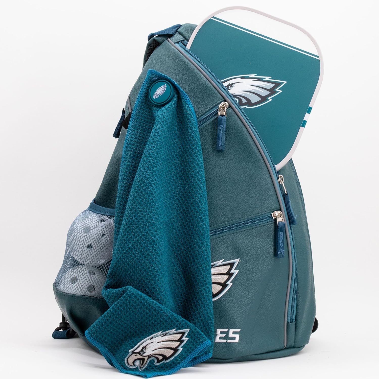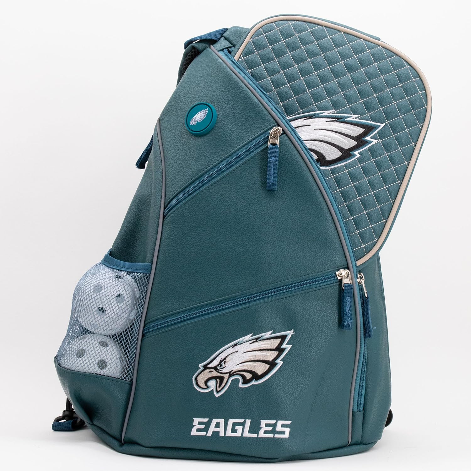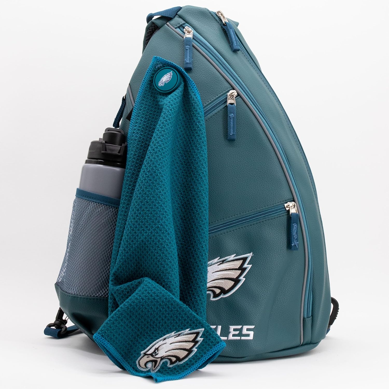 The PU Leather Embroidered Team Backpack features a magnetic towel catch, five zippered pockets and four internal mesh pockets, water bottle pocket and ergonomically designed straps for shoulder or cross-body carry.