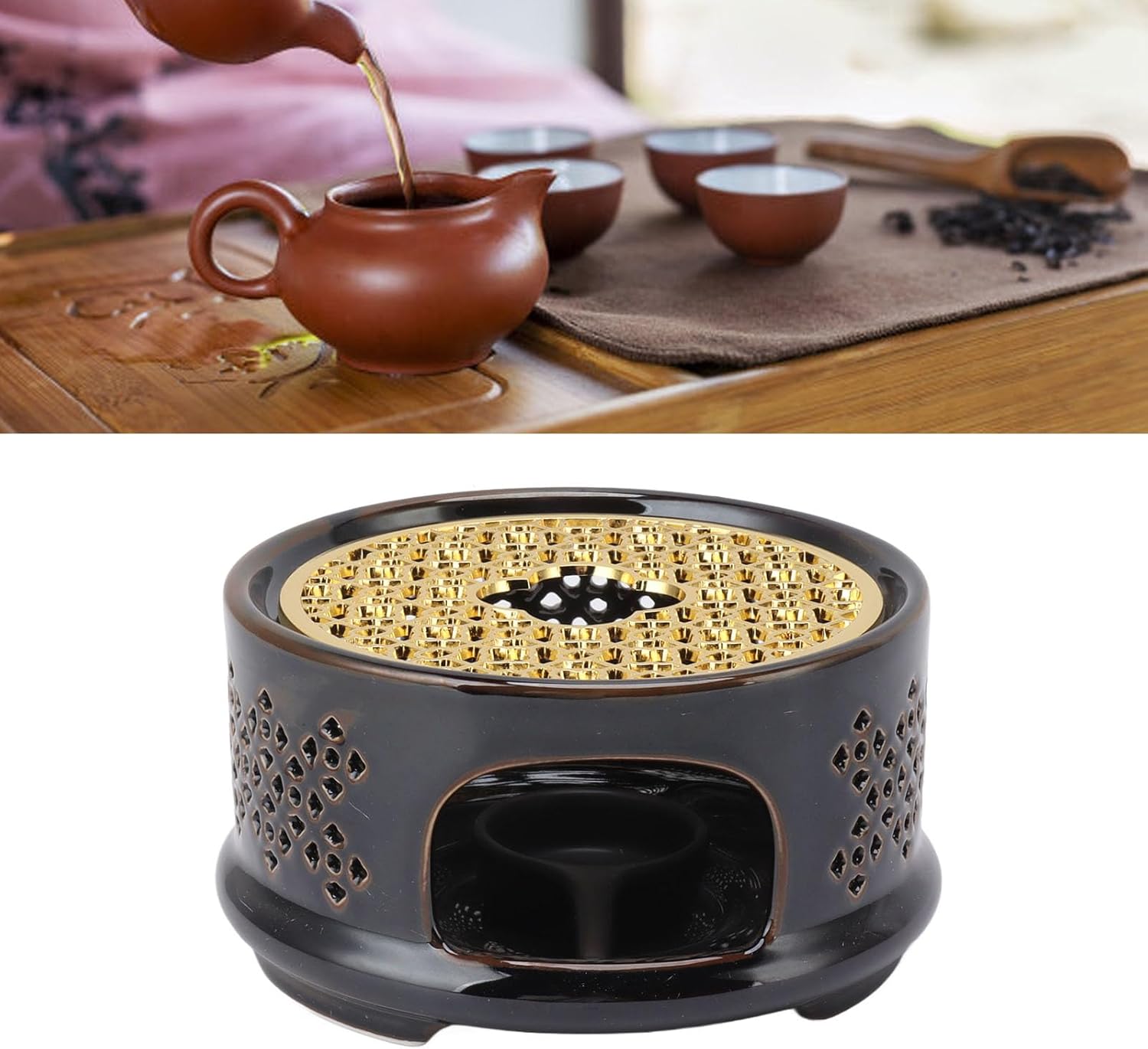 [PREMIUM QUALITY MATERIALS] Crafted from high quality fine ceramic and sturdy iron this teapot warmer ensures durability and long lasting performance. The robust construction can securely hold teapots and tea lights keeping your favorite tea or coffee warm and refreshing for hours. The elegant design adds a touch of sophistication to your tea time experience.[SAFE AND SECURE DESIGN] The bottom features a fixed soft cushion firmly attached to the porcelain surface to protect your teapot from cracking or breaking. This thoughtful design ensures stability and safety while keeping your teapot securely in place. The cushion also prevents scratches on your tabletop making it both functional and protective.[ELEGANT CONCAVE DESIGN] The round concave design of the porcelain bottom not only enhances the product's aesthetic appeal but also provides ample space for tea lights. This design ensures efficient heat distribution keeping your tea or coffee at the perfect temperature. The textured finish adds a luxurious feel to your tea setup.[EASY TO USE] Simply place a burning tea light into the teapot heater to maintain a constant warm temperature for your tea or coffee. The practical design makes it effortless to use whether you're at home or in the office. Enjoy a warm cup anytime without the hassle of reheating.[VERSATILE AND SPACIOUS] This tea warmer features a flat teapot holder suitable for various teapot sizes ensuring a secure fit. The spacious design accommodates different teapot styles making it a versatile addition to your tea accessories. The included candle holder and spoon lid add convenience and completeness to your tea warming experience.Spec:Item Type: Teapot WarmerMaterials: Ceramic, IronWeight: Approx. 624g / 1.4lbPackage List:1 x Tea Warmer1 x Tea Stove Mat1 x Candle HolderNote: