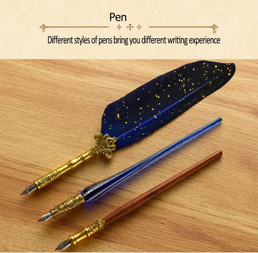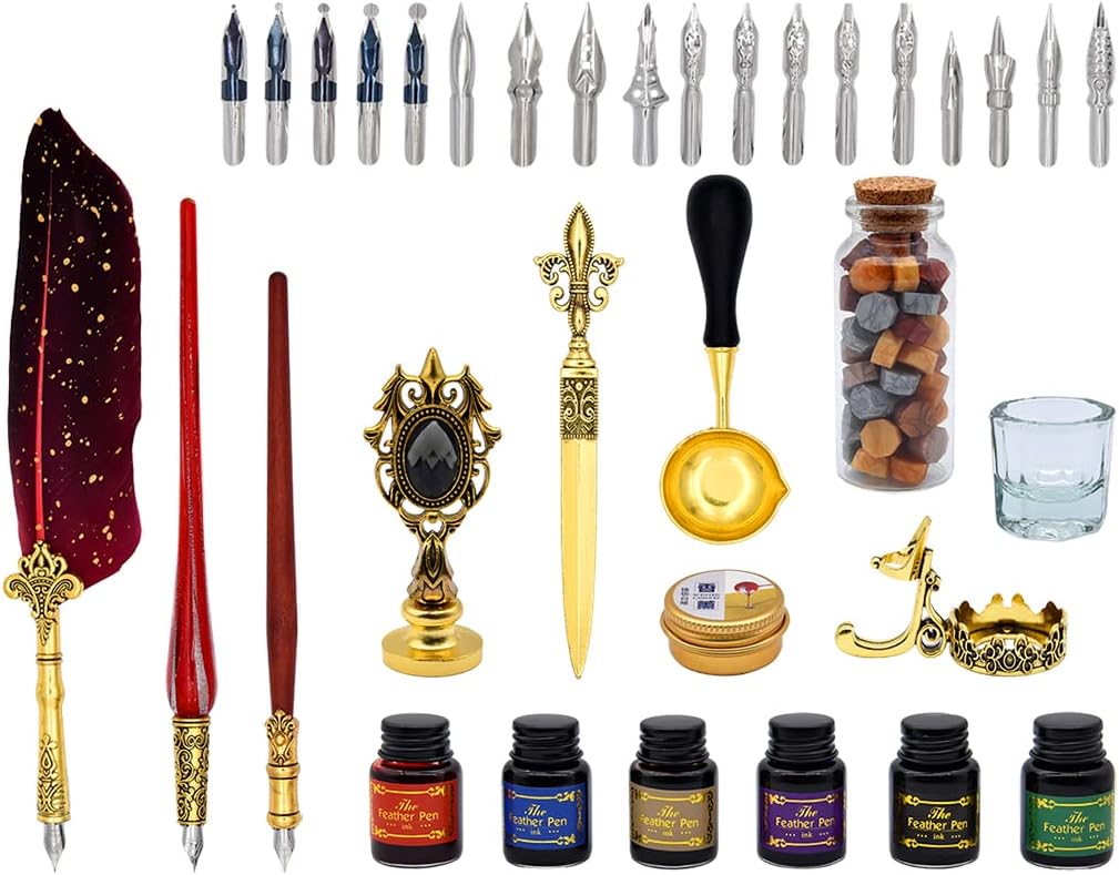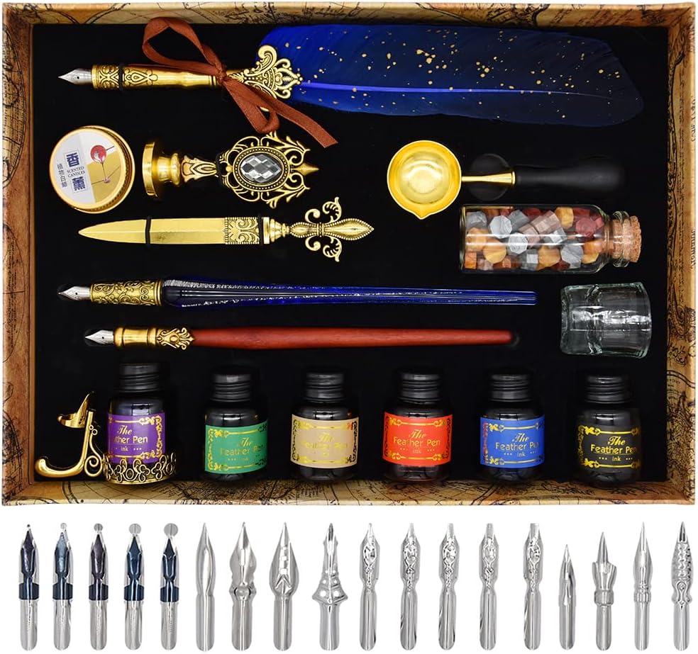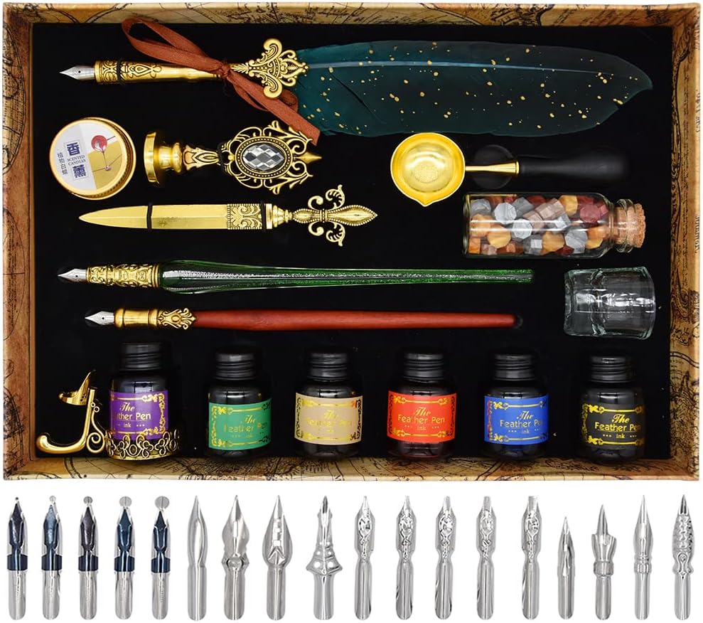 Specifications Material: Stainless steel, feather, metal Color: red, blue, green, grey Features: Traditional quill pen combined with fashionable design of packaging, to bring you different visual impact. Quill pens use natural feathers, and each quill pen is unique and will have certain differences. 6 different colors of ink to meet your needs for painting, writing and recording life. Featured with 18 replaceable nibs, suitable for quills, crystal glass pens and wood pens. Choose pens with different nibs for writing or painting as needed. Simply hold the nib gently and pull it out to replace the nib easily. Package Include: 1 x feather pen 1 x wood dip pen 1 x glass dip pen 1 x bottle fire paint wax 1 x seal stamp 1 x white wax 1 x spoon 1 x pen holder 1 x open envelope tool 1 x glass cup 6 x bottle ink 18 x replacement nibs Note: 1. Nature feather please do not stroke the feather reverse its hair. 2. Do not clean the feather by hot water. 3. Use hot water or detergent clean the nibs the dry it with soft cloth. 4. Dip the ink at the line no more than the half of nib, after using please clean the nib to make sure it work well next time.